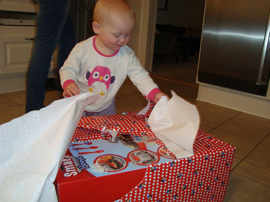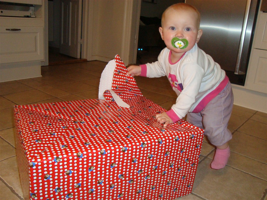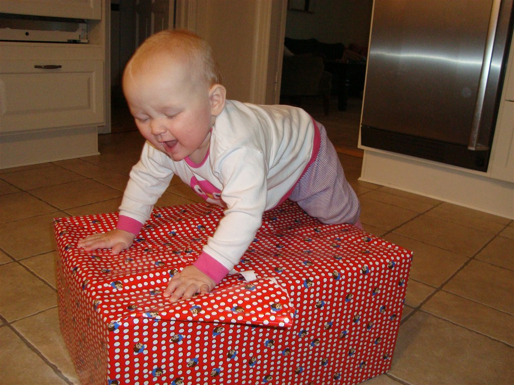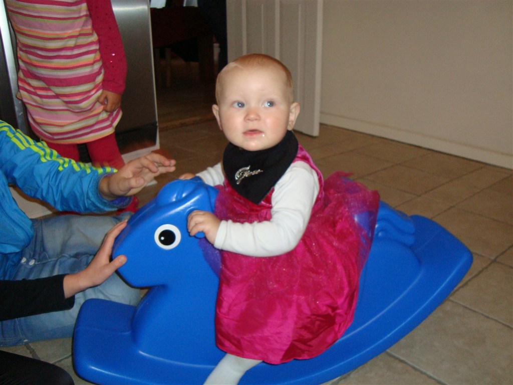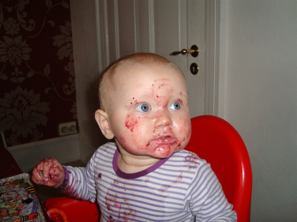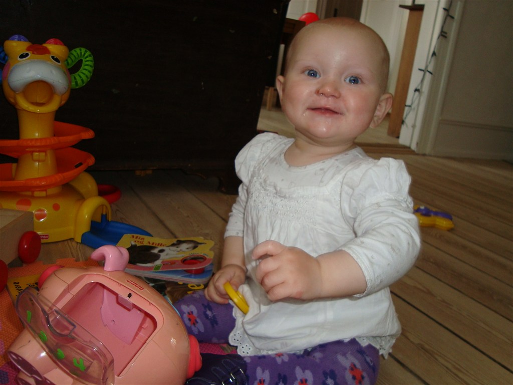 Hun har udviklet sig meget på det sidste, går et par skridt hist og pist, har fået flere tænder, drikker selv, spiser det meste mad selv osv.