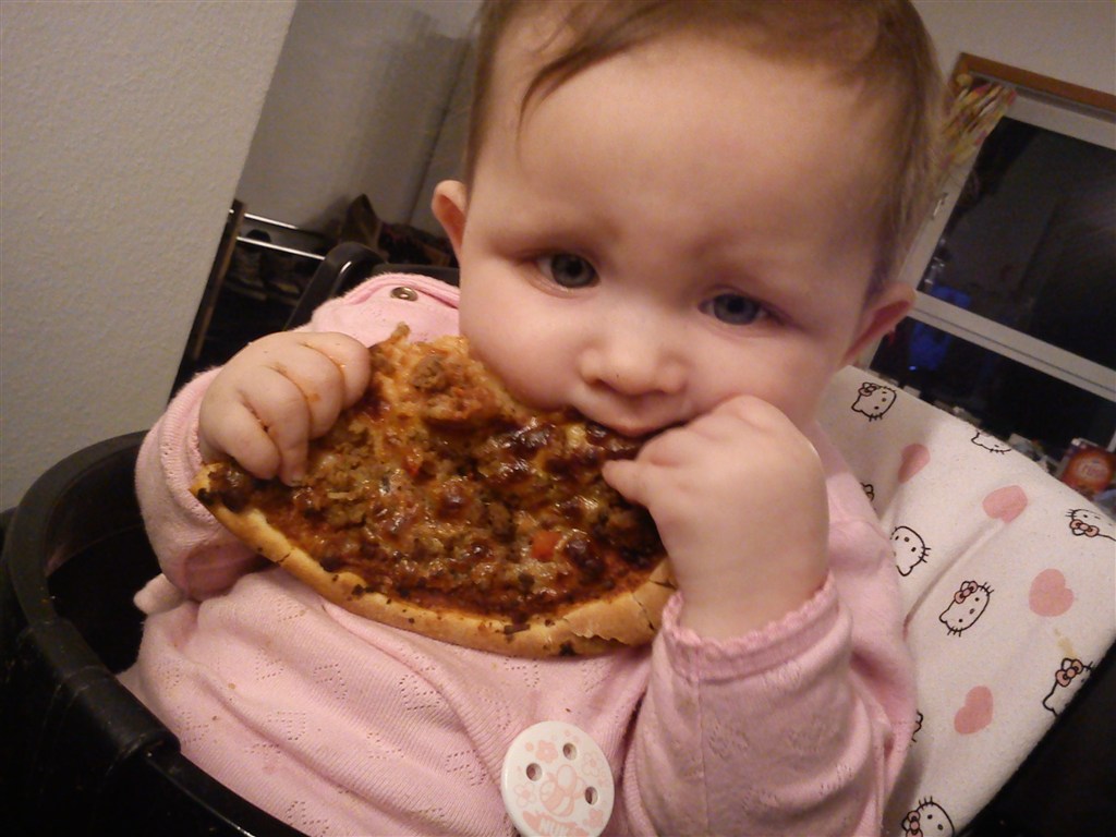 Hun spiser alt, og hun gør det med glæde, og når hun har spist meget nogen gange sidder hun rigtig og slår mave, og det ser så sødt ud..