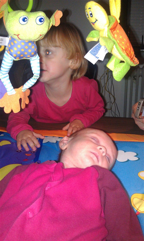 Nåårh, hvor er hun kær. Det lader til at storesøster synes aktivitetstæppet er lidt mere spændende end lillesøster gør, hi hi!