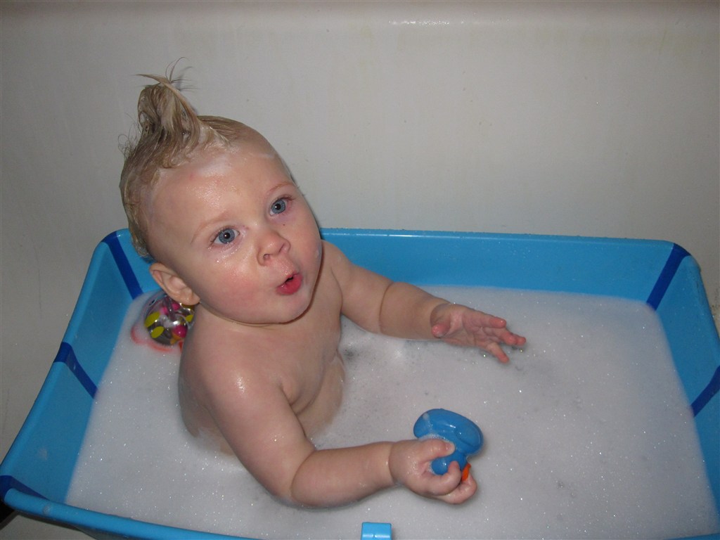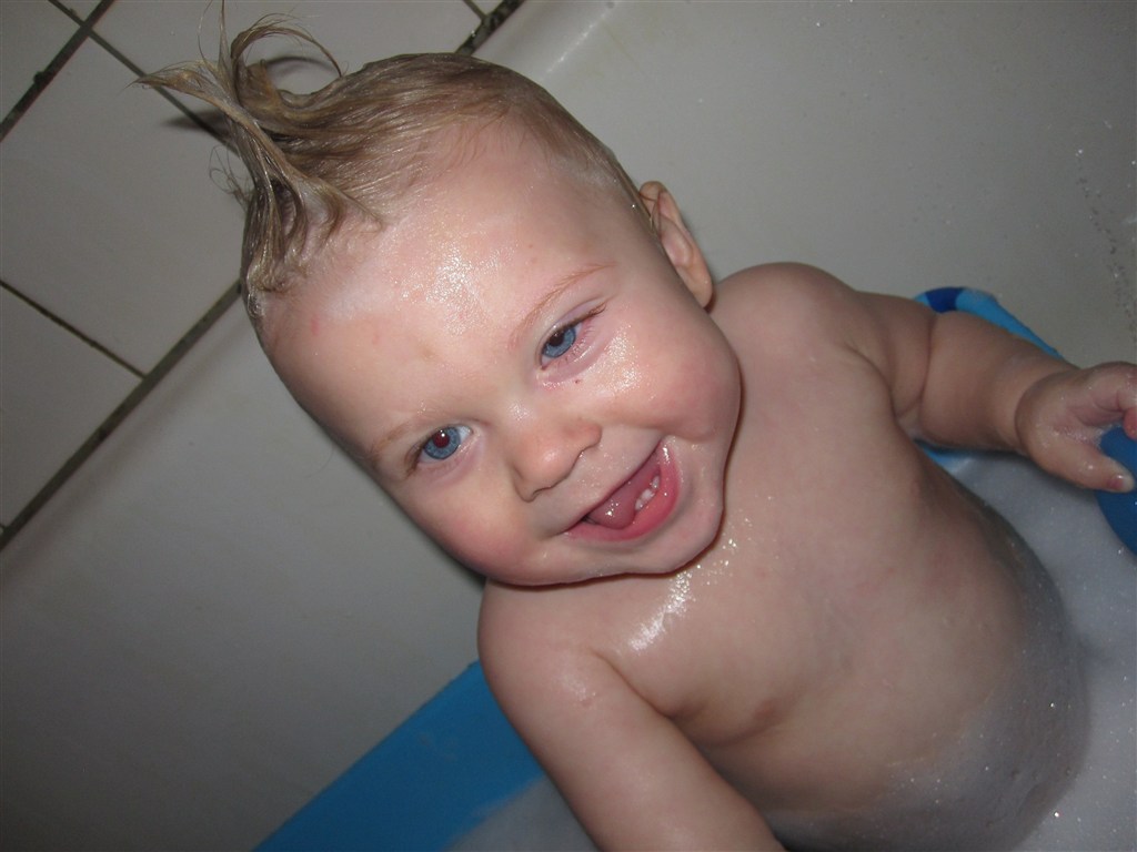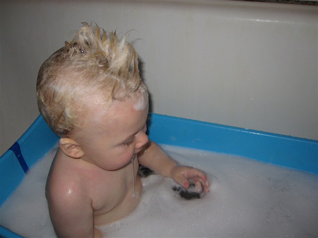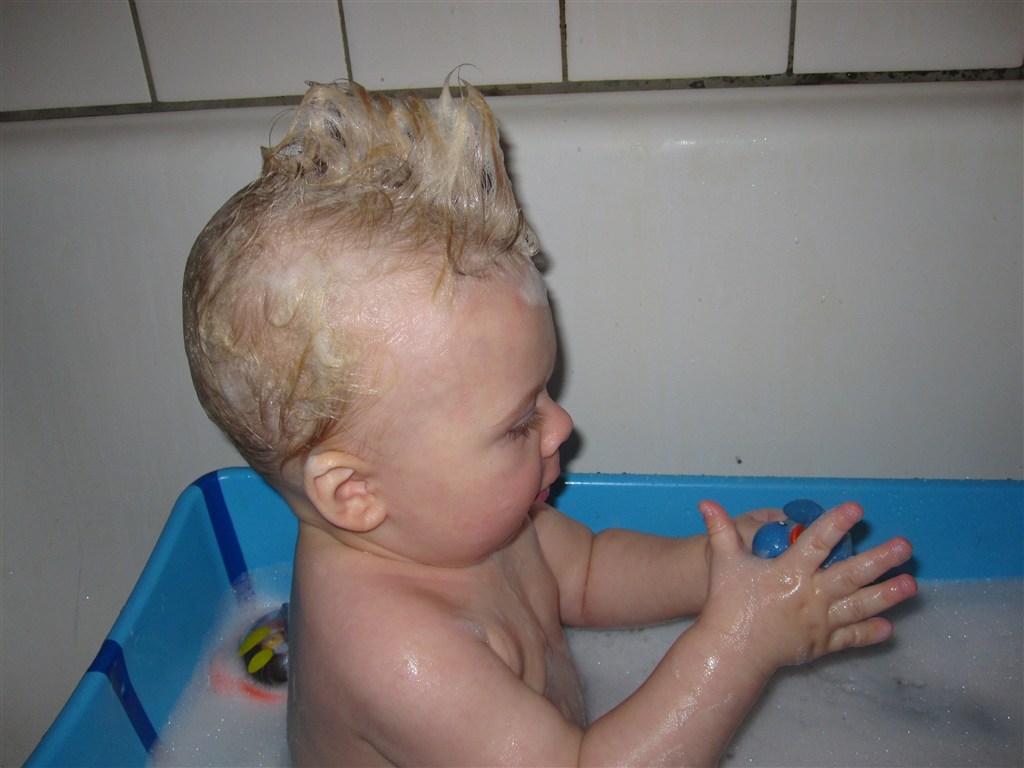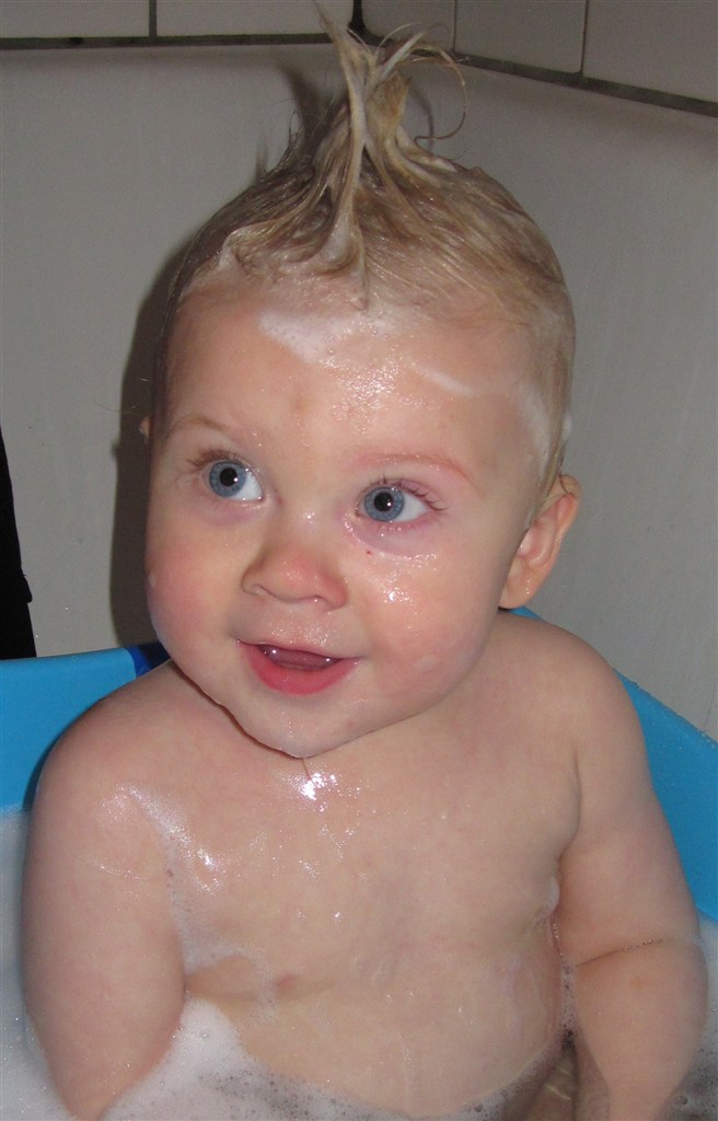 Han har pænt langt hår efterhånden, og det kunne den "onde mor" altså ikke lade vær med at lave lidt sjov ud af i badet