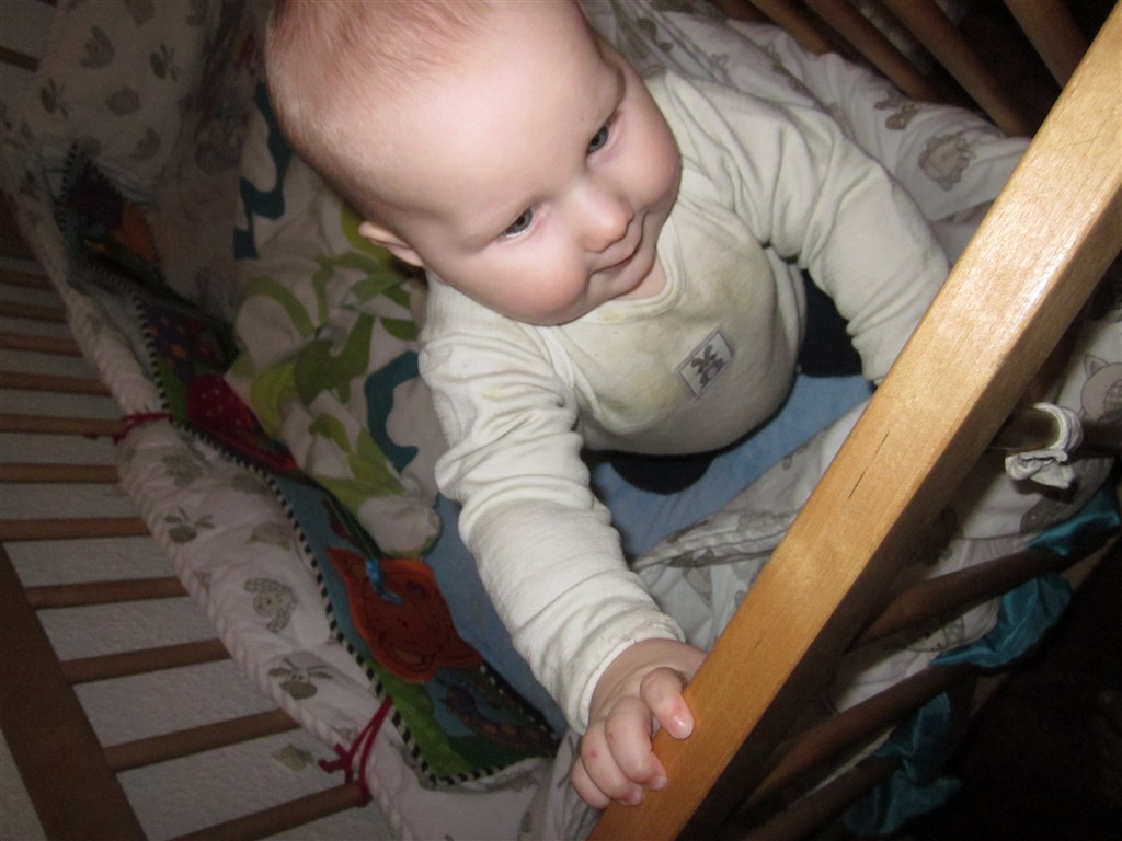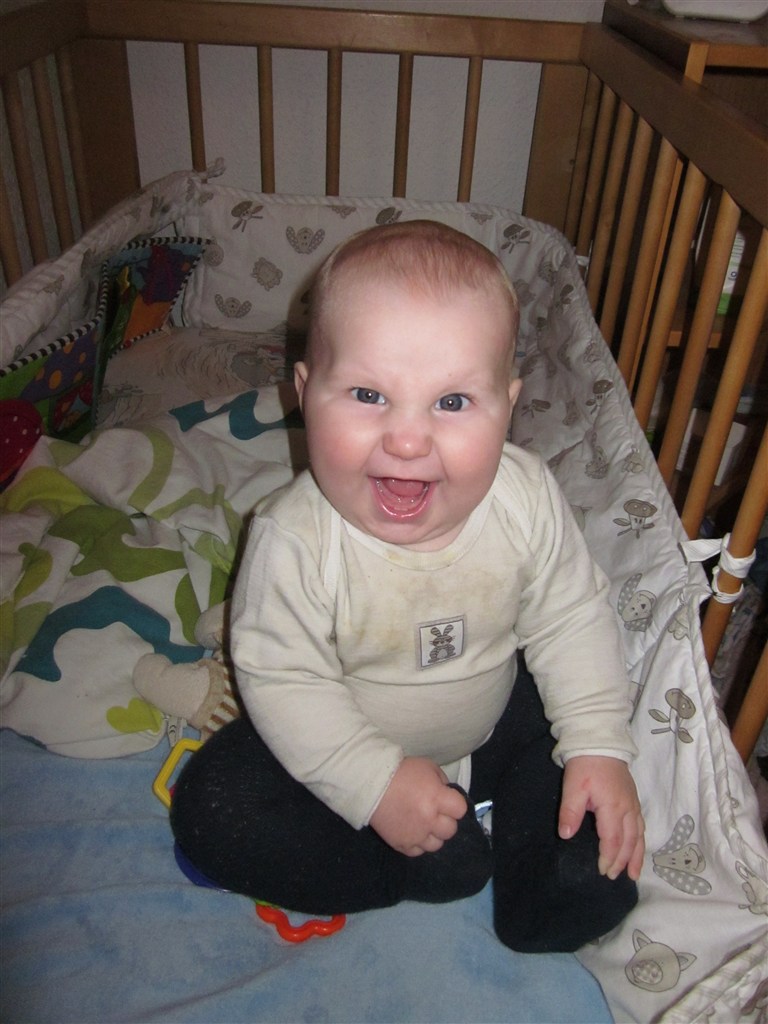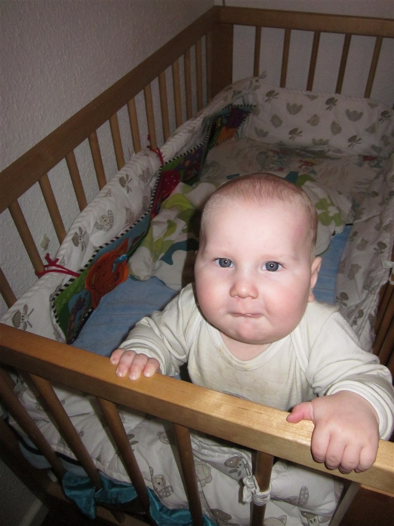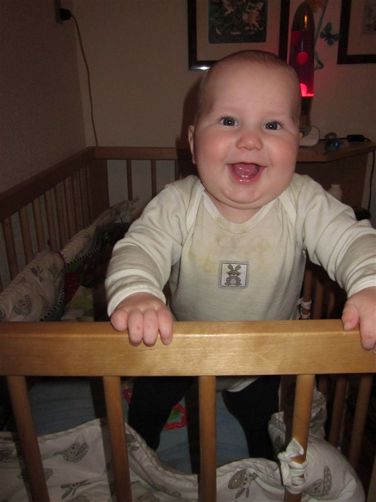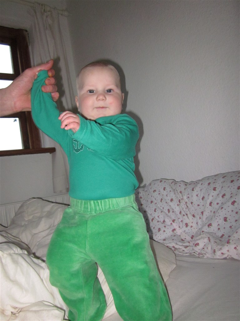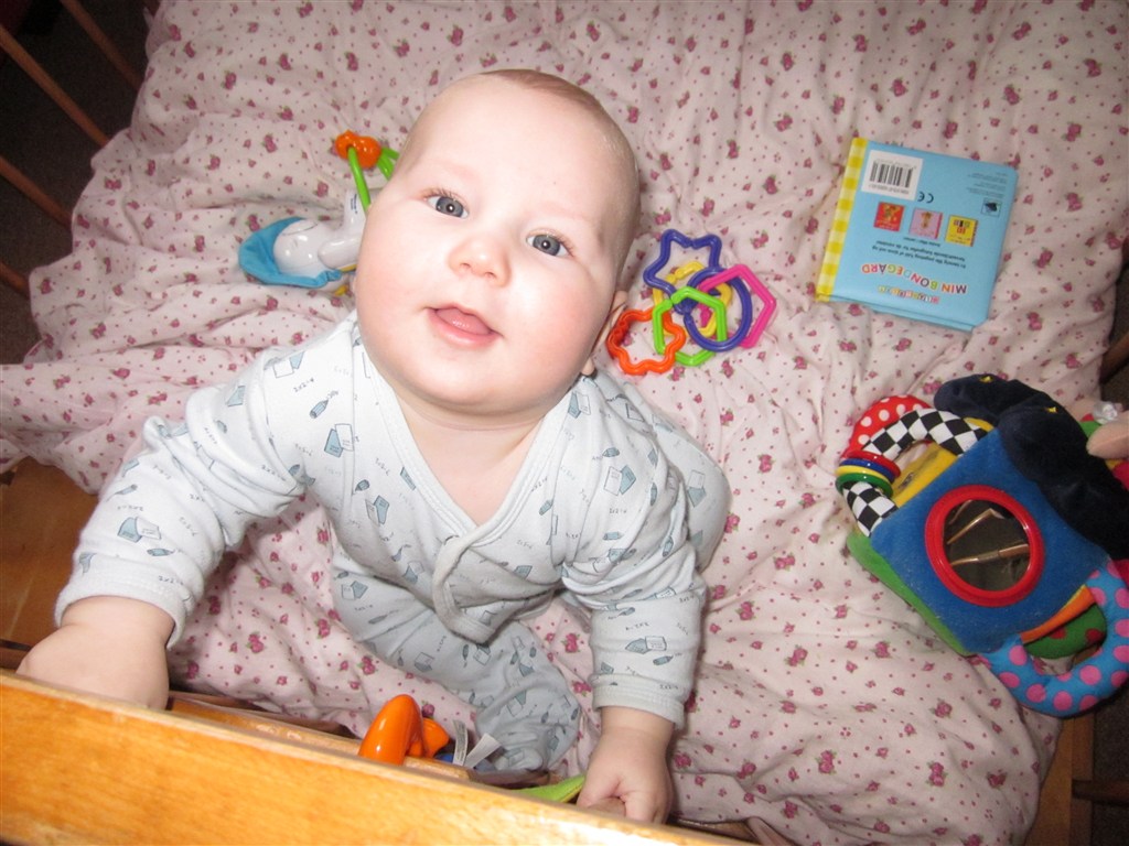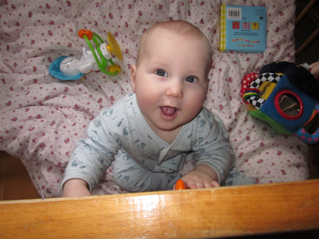 Men status er at Silas har en fortand for oven der er på vej, så han sover reeeet dårligt om natten og er meget mor og far pylret... Han kan selv stille sig op ved at tage fat i kravlegårdskanten eller hans tremmesengekant, til trods for at vi har hævet gærdet Silas sidder også helt uden hjælp og kan fra liggende stilling perfekt trille op i i siddestilling Som altid er han en glad dreng med masser af krudt i røven og for hulan hvor jeg elsker min lille fjollerik...