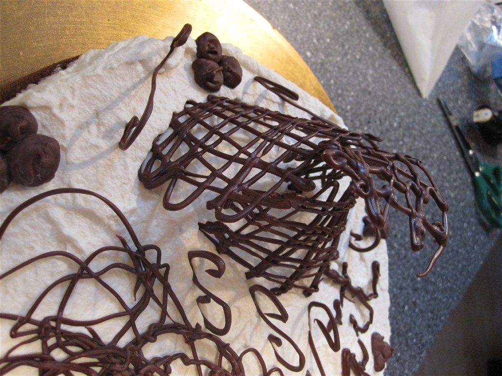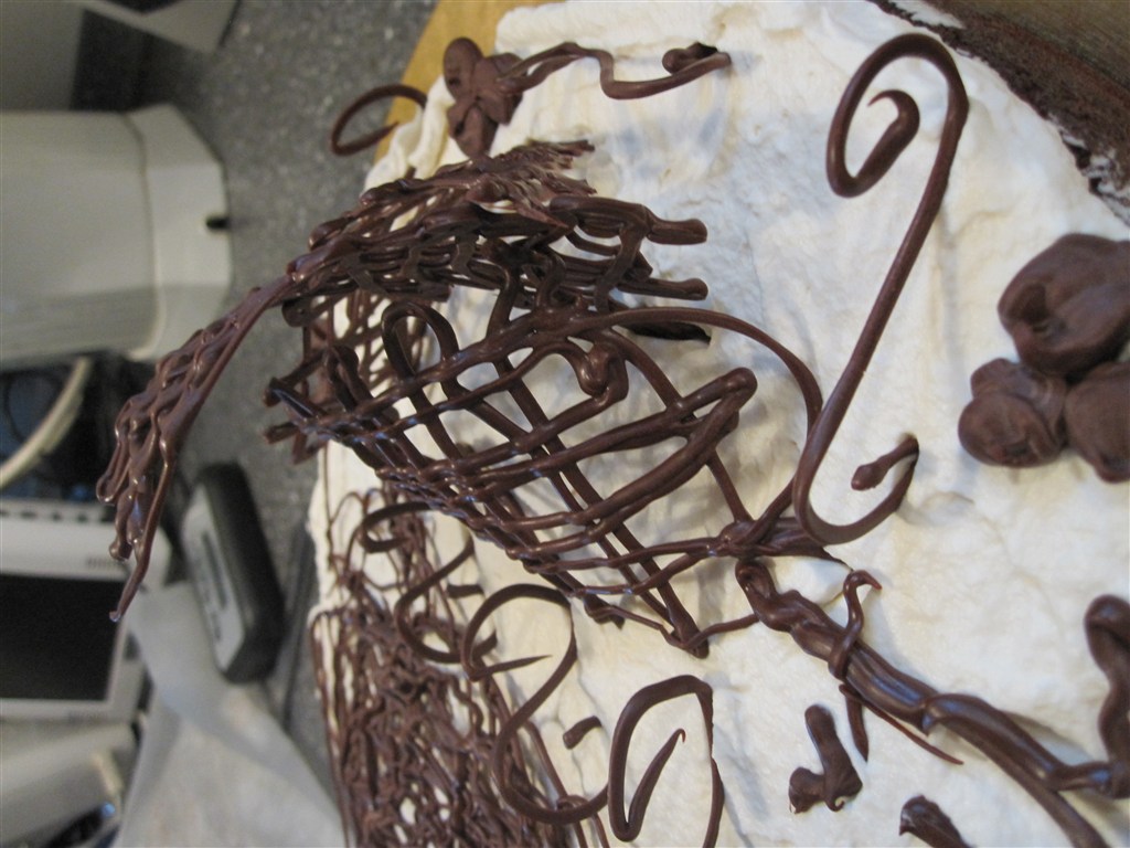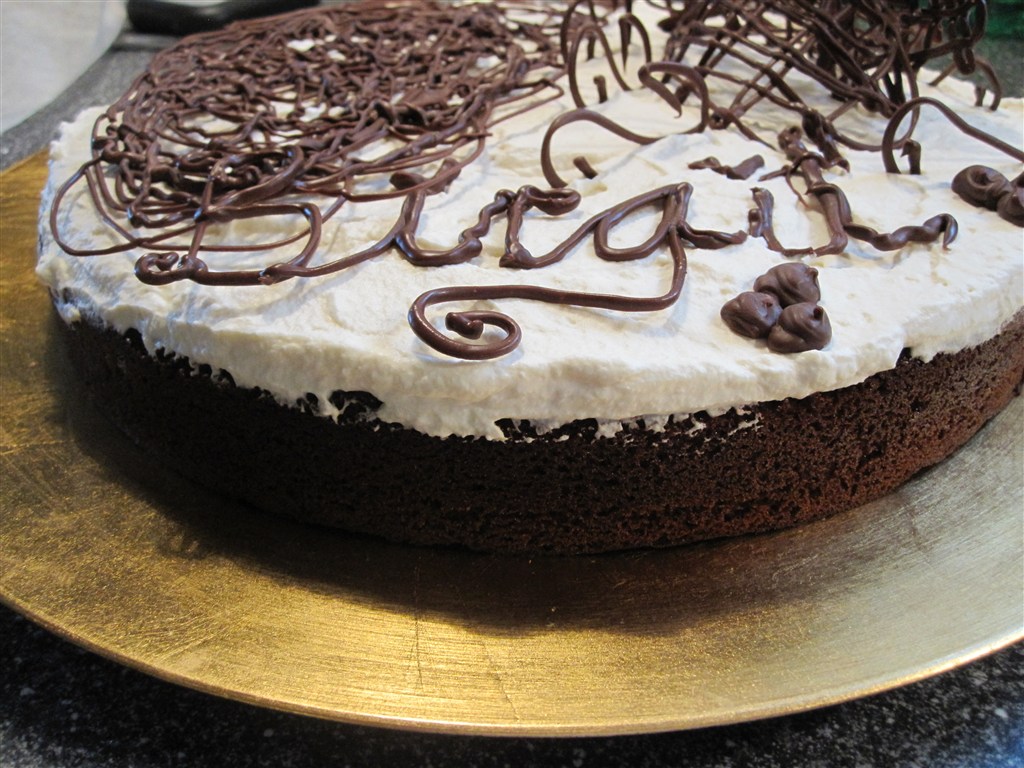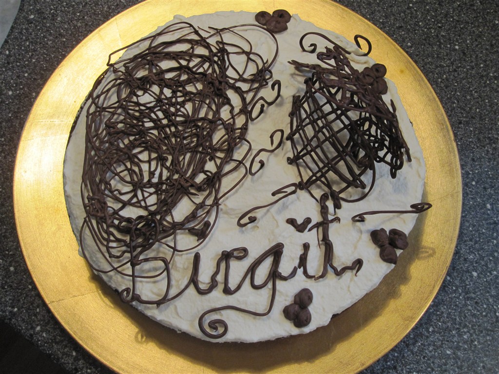 Det er en chokoladekage som der i midten af dejen er lagt marcipan skiver og nugat skiver og drysset med krokant appelsinskal...Der er pisket en Hasselnødde Bailey creme på toppen og pyntet med chokolade...
