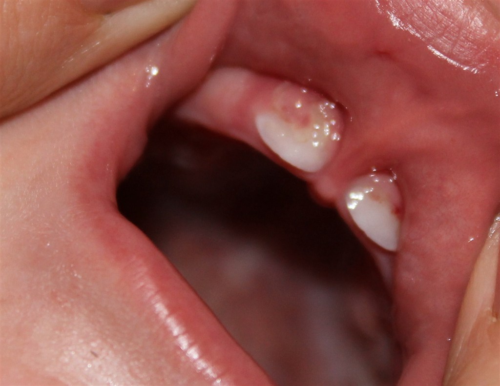 Det har resulteret i blødende tandkød MANGE gange. Men i går gik det rigtig galt og en stor luns er gået af (først hang den blålig med røde blodtråde ned over tanden og jeg var 100% sikker på at tanden var smadret!) Men så her til aften er blodplamagerne faldet af/forsvundet og vi kan nu se resultatet. Det er den højre tand (til venstre i billedet) og man kan jo se at der er en luns der er skrabet væk. Tror i at det kommer igen? Og tror i tanden har taget skade? Blodpletter i den venstreside er fra da han faldt IGEN idag. To gange. Altså enten må han lære at tage fra med armene eller vente et par mdr. endnu med at prøve at gå. Han er skisme da ikke for kvik