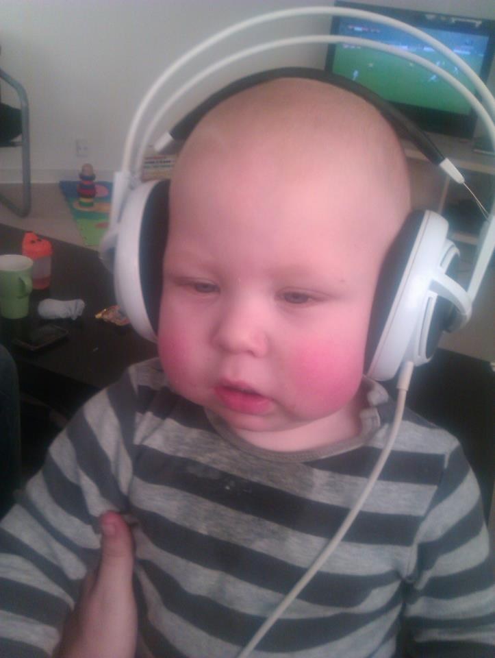 MissChrista skriver: Åååh, det er synd for lille-chefen! Han har feeeber! 39,5 og han veksler mellem at have det rigtig skidt og være nogenlunde frisk. Han har fået mellemøresnbetændelse, så han er på pencilin .. Det er første gang jeg har en rigtig syg dreng - og så er han tilmed ved at få tænder oven i købet!Men her er da et lille hyggeligt billede, af Victor der hører Bamse & Kylling ...Det er farmand der sser bold i baggrunden Derfor hørebøfferne