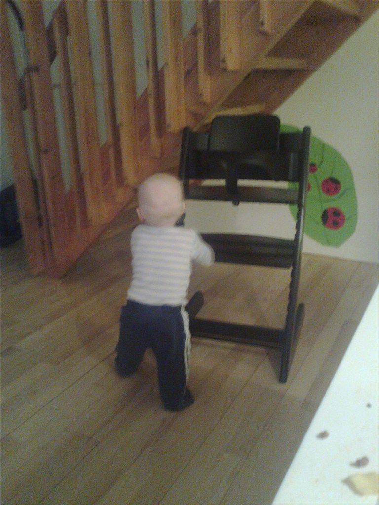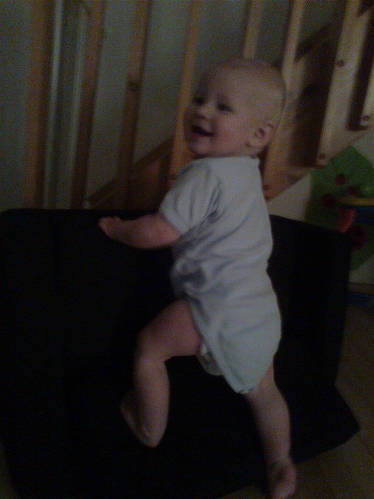 Billed 2 - har skubbet sin egen lille sofa hen til trappen og rejste sig så op i den.