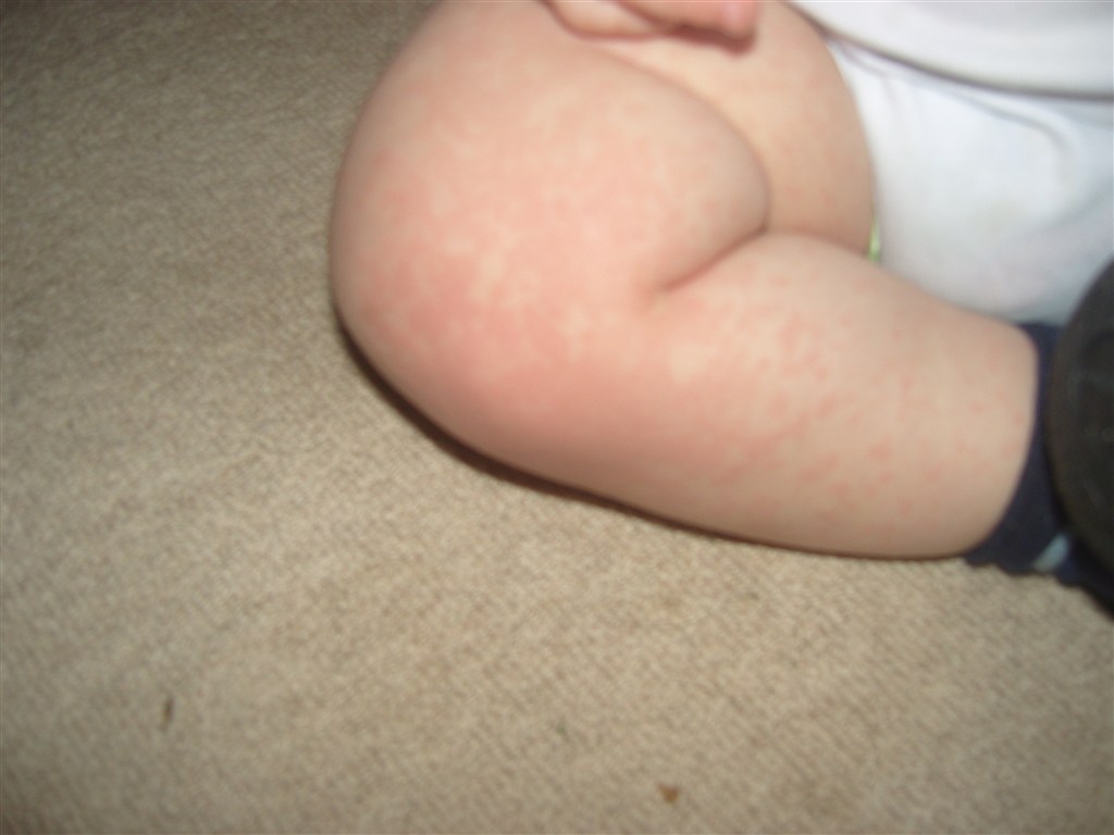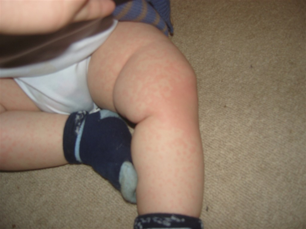 Det er svært at se udfra billedet om det er nældefeber eller ej, jeg lider selv enormt meget af nældefeber pga. allergi og jeg får store røde plamager på huden som nærmest er "hævet op" på huden så du tydeligt kan mærke dem.