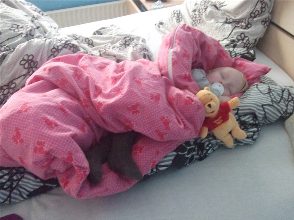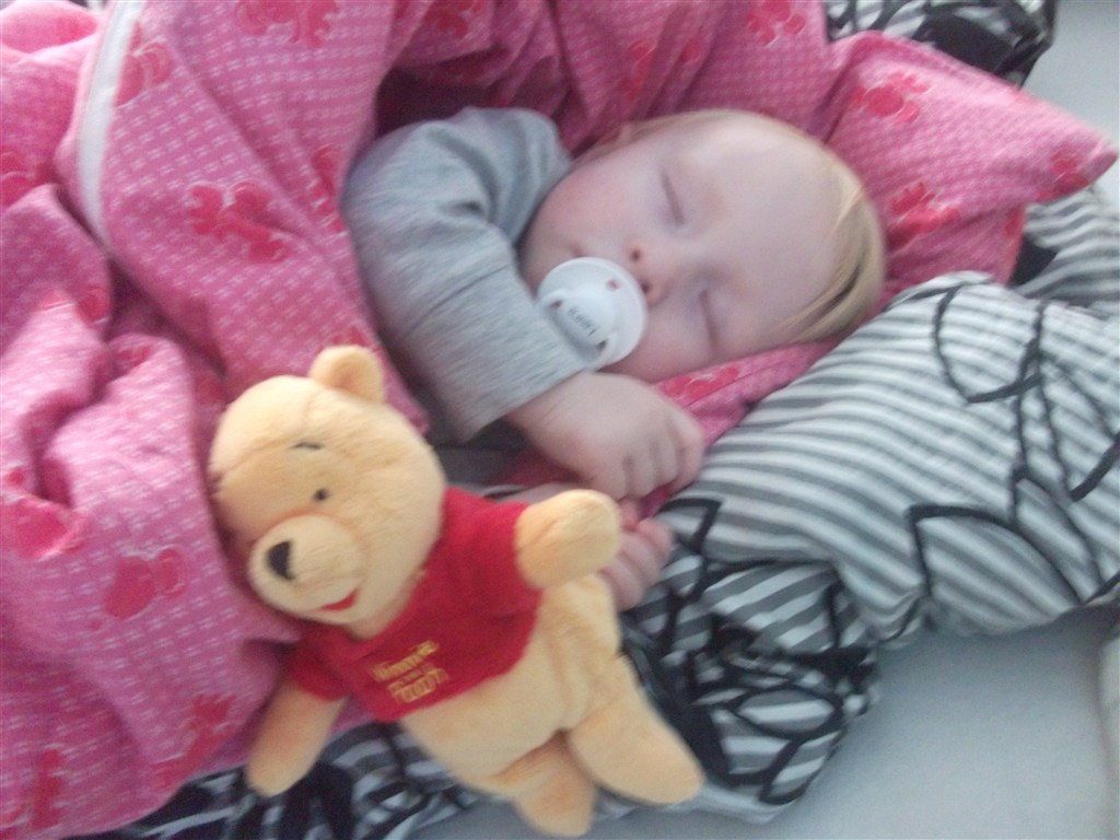 Laura er begyndt at sove til middag indenfor - det har hun aldrig ville før.. Dog KUN i mor og far's seng - kan dog putte hende over i tremmesengen lidt efter..