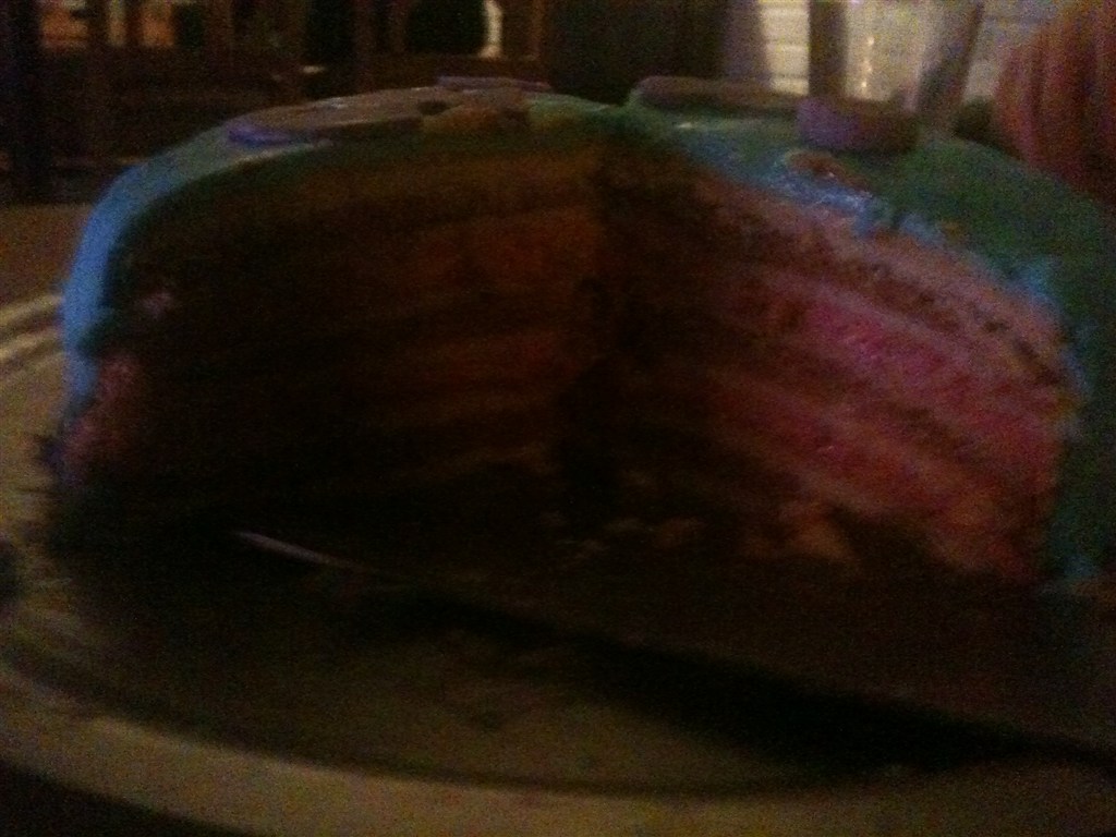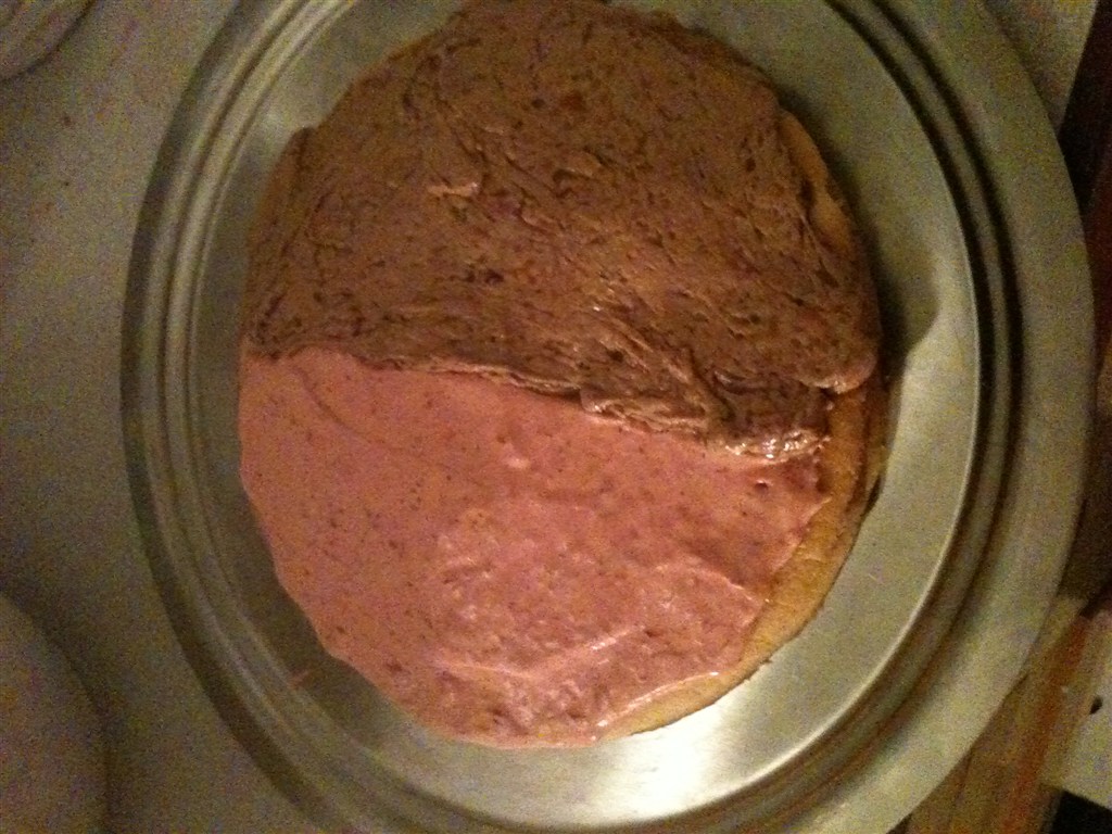 Det er alm. lagkage bunde smurt op med jordbær mousse og toblerone creme og smør creme.
