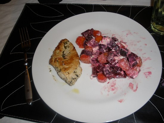 Rødbeder og gulerødder skrælles og koges sammen i usaltet vand. Når de er små"møre", men stadig har lidt bid, hældes vandet fra. Rødbeder skæres i tern og gulerødder i skiver. Hældes i en skål. Feta skæres i tern (hvis man køber det der er i én stor klump), og hældes ved. Der tilsættes en tsk olivenolie, salt, peber og godt med timian, og det hele blandes. Bon appetit!
