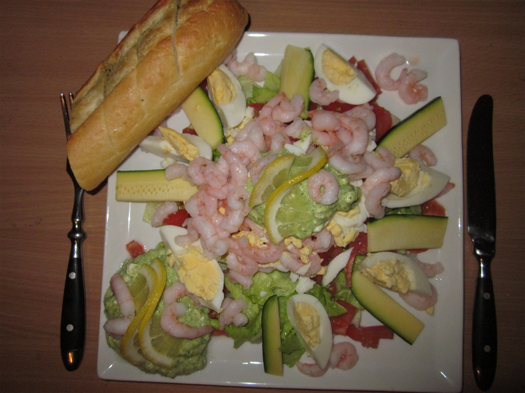 Skær æggene i både, tomater i tern og bland med salaten. læg rejer og squashstængerne på salaten. Server med brød.