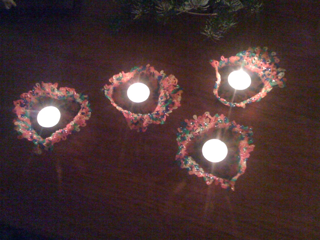 den lå hun så på en bageplade med papir under og så hældte hun pinke og røde hjerter i og smeltede dem... en snor igennem da de var færdige og voila... så var der juletræ's pynt..