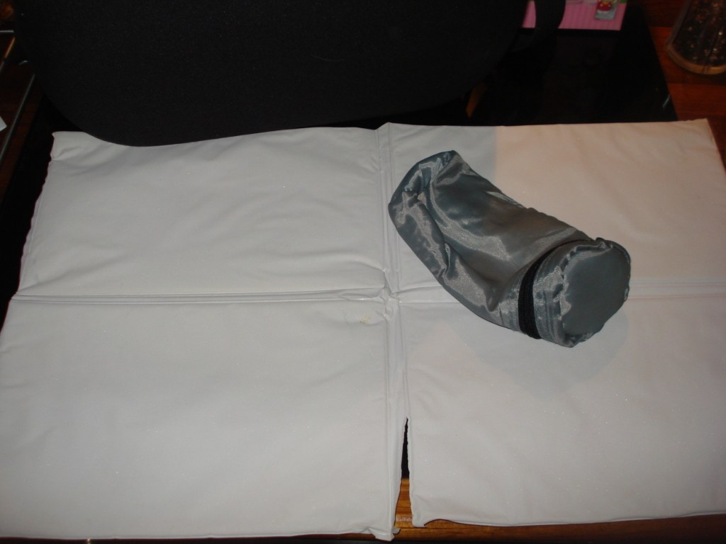 Der medfølger flaskevarmer og pusleunderlag, som ses på det ene billede, hvor der også kan ses at pusleunderlaget er gået lidt i stykker.