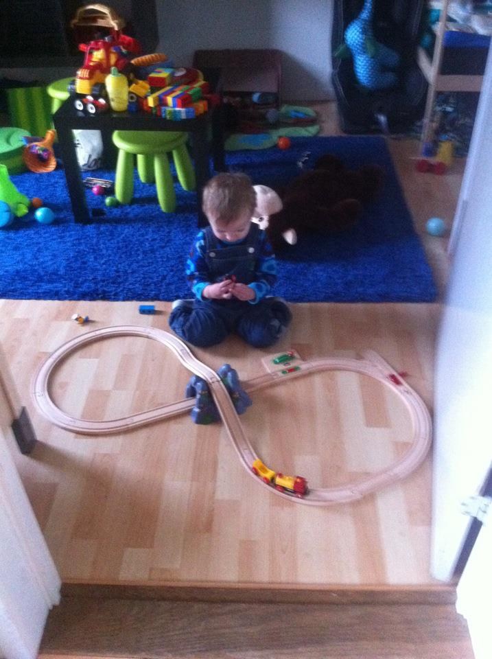 På det andet leger han med hans nye togbane som vi købte meget billigt i netto..