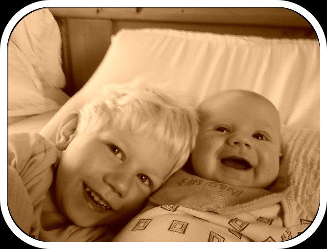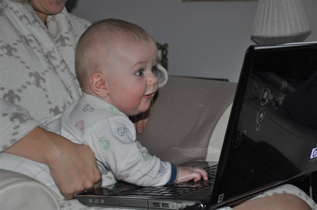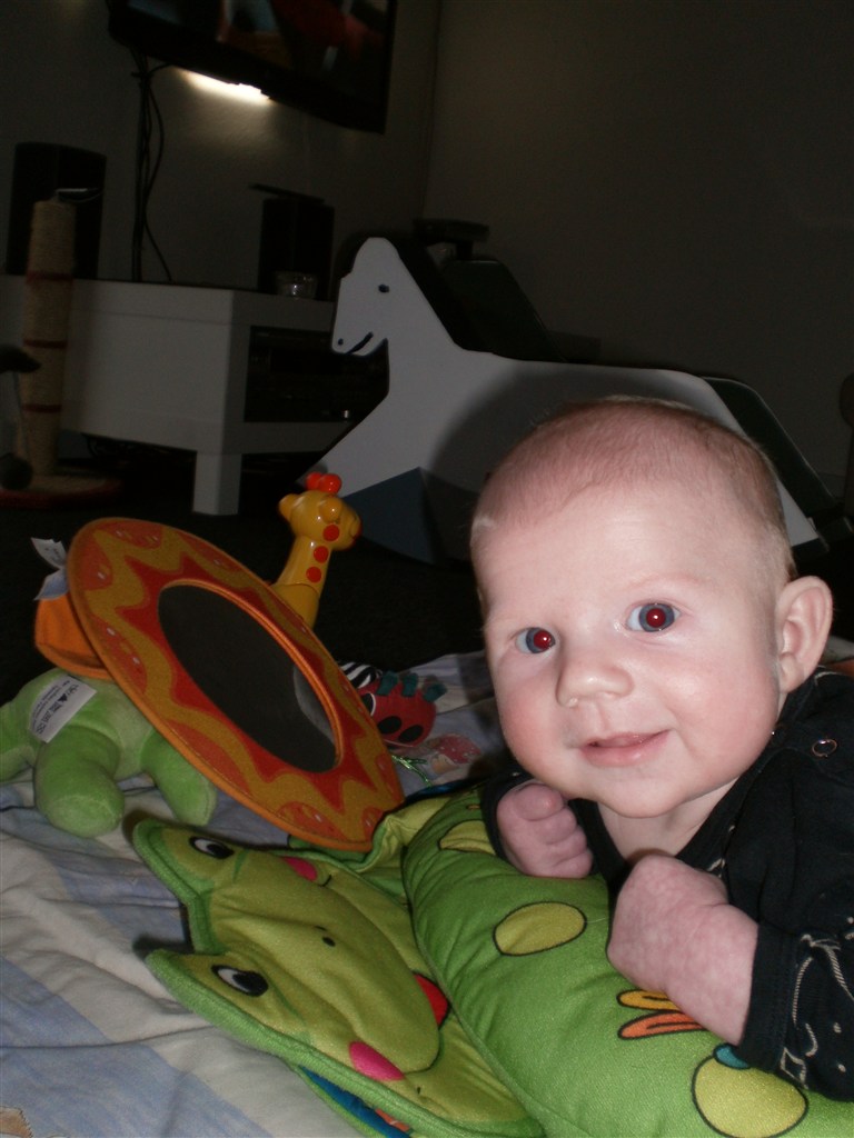Han griner med lyd, og pludrer meget. Er MEGET bevidst om hvem mor og far er...