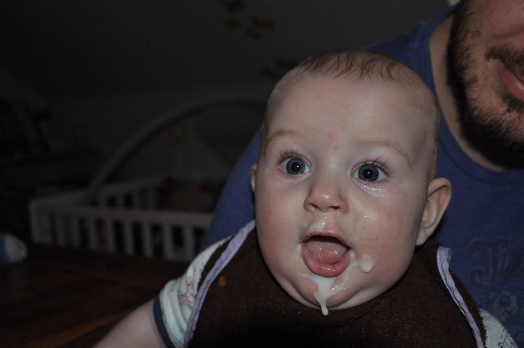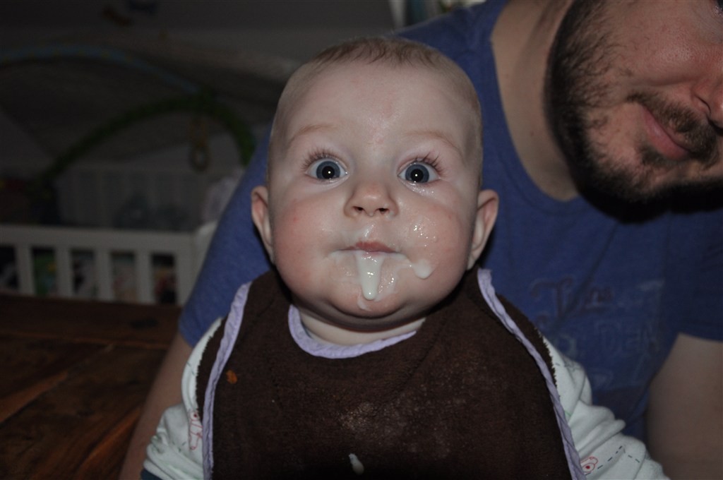 Han spiser sig mæt i grøden nu, så den erstatter ca 1½-2 flasker, mosen er ved at blive indført stille og roligt.