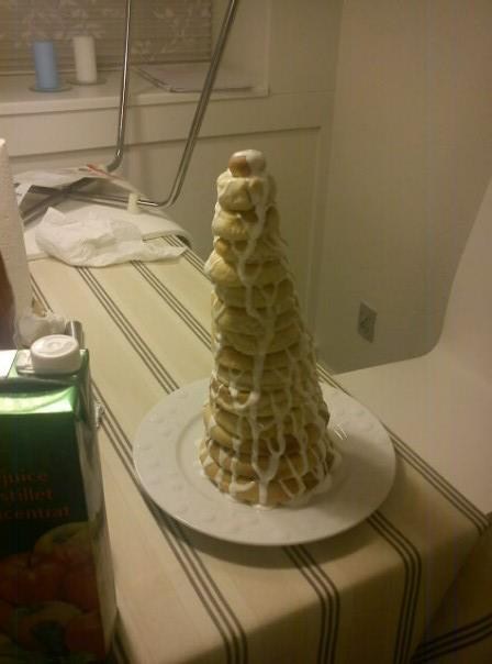 Det er første gang vi har lavet en kransekage, så vi er da ok tilfredse med resultatet! Vi håber at dem som skal spise det i morgen kan fortælle os at den er helt perfekt og smager dejligt! - Vi kan nemlig ikke selv lide kransekage!