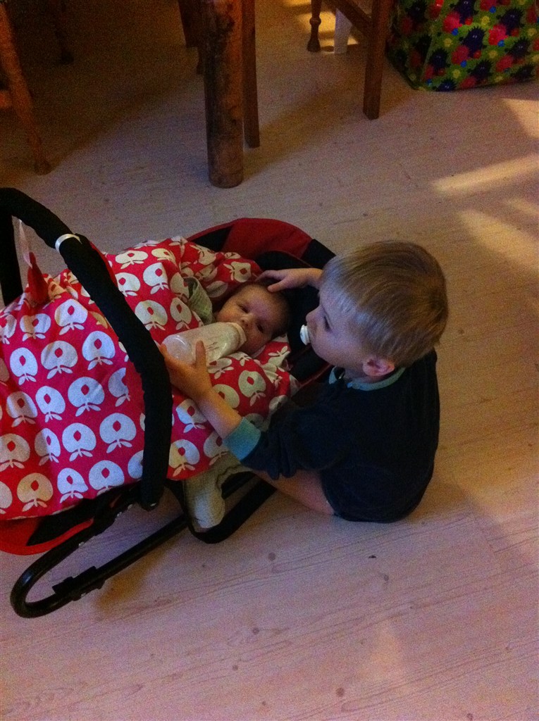 er helt vild med det hvor han giver lillesøster flaske! aaarrrwww det går da lige i moder hjertet hva