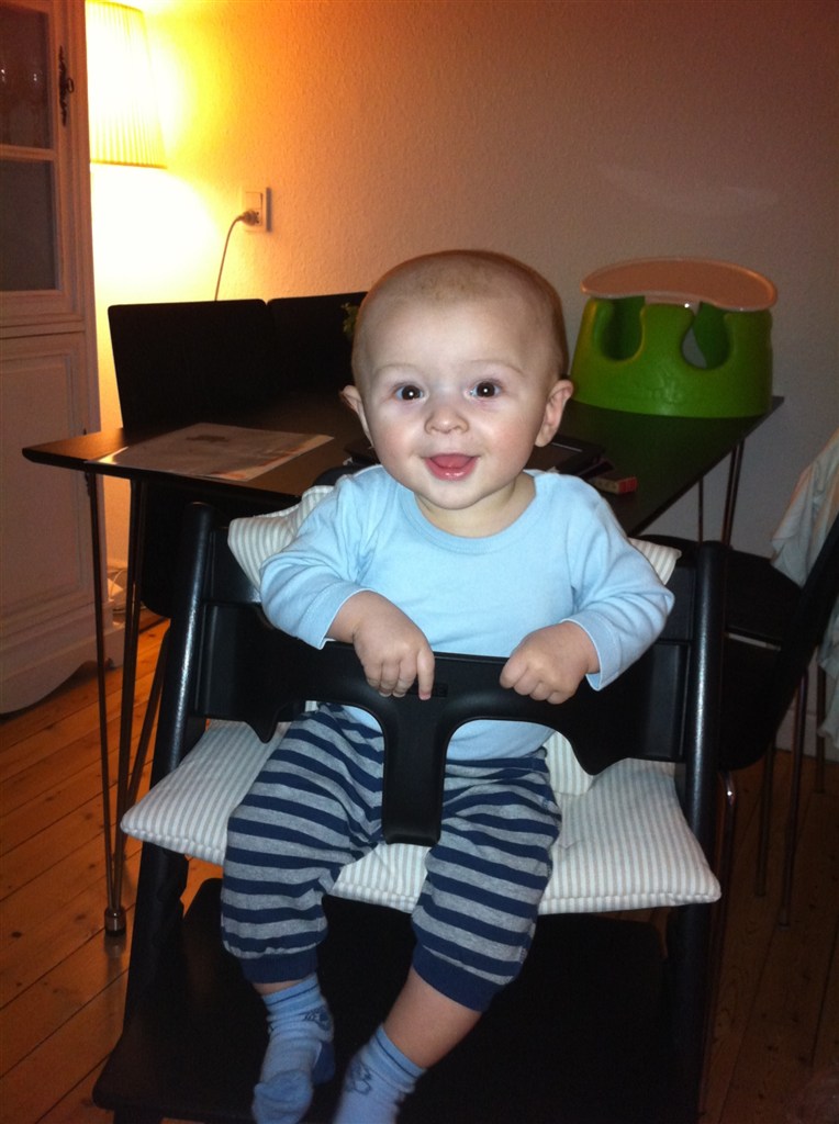 Han spiser grød med stort velbehag, vi kæmper dog stadig med grøntsagsmosen, meeen det skal nok komme (I hope