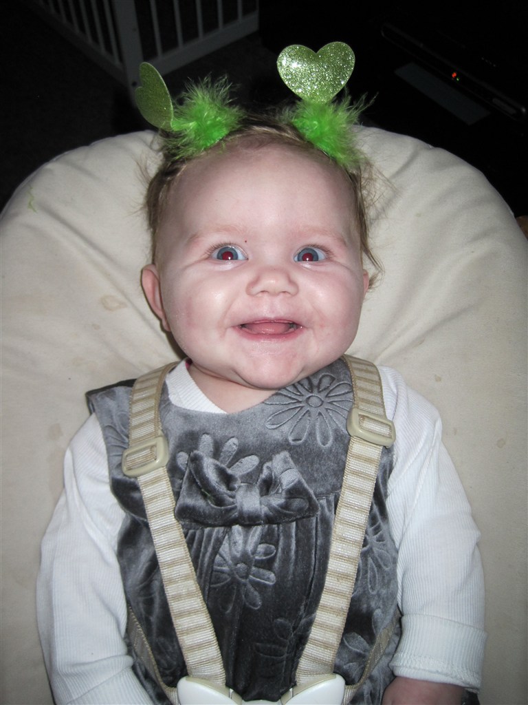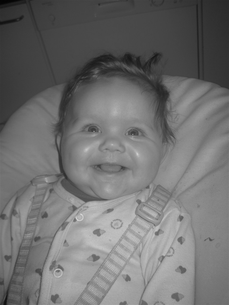 Hun er en glad og tilfreds pige, som stort set smiler hele tiden....