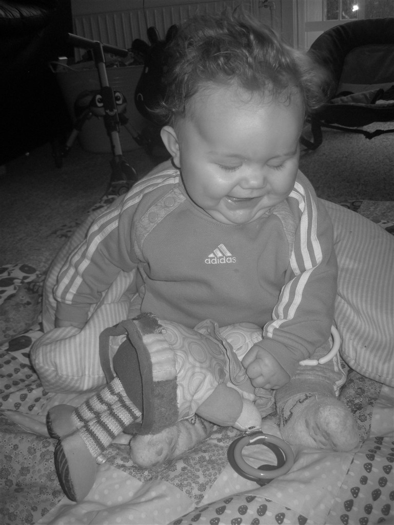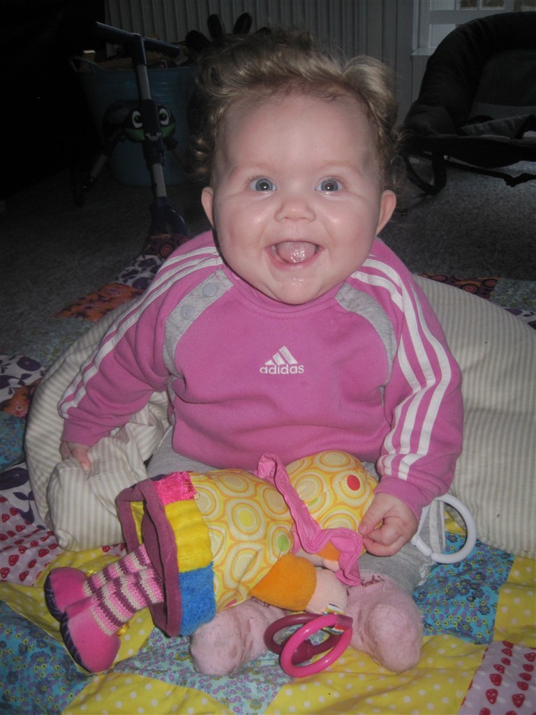 Derudover er hun lige begyndt at sidde selv, og inden for de sidste par dage har hun fundet ud af hun kan skubbe sig frem hvis hun kommer op på hendes knæ også skubber frem med fødderne i guldtæppet.....