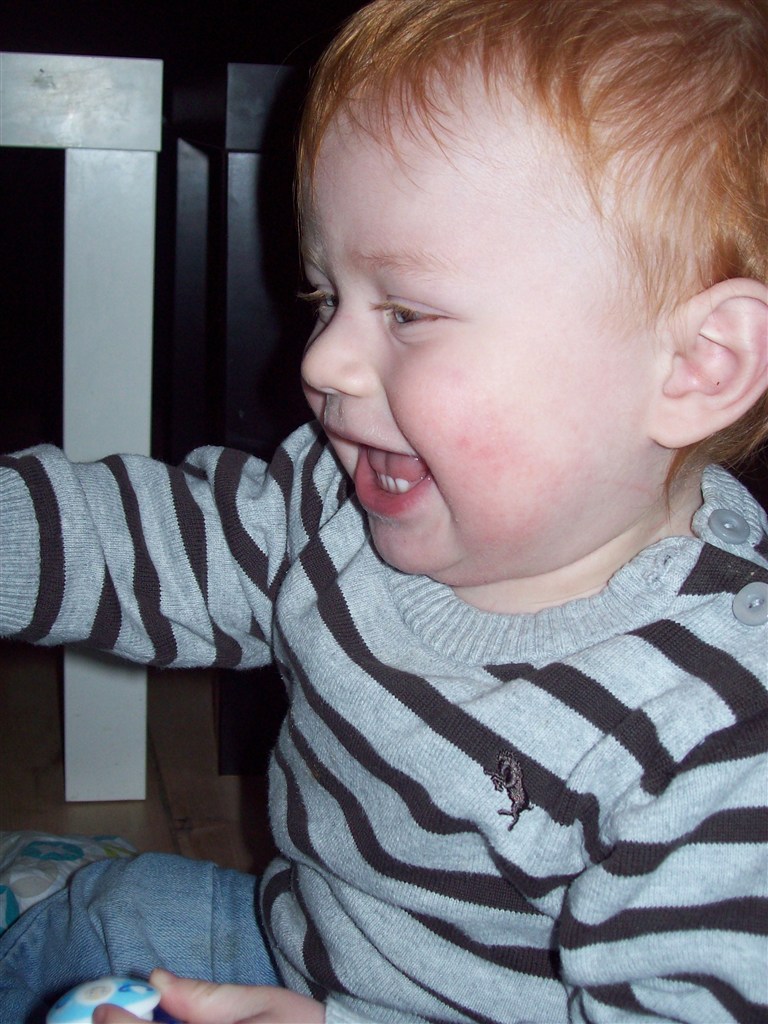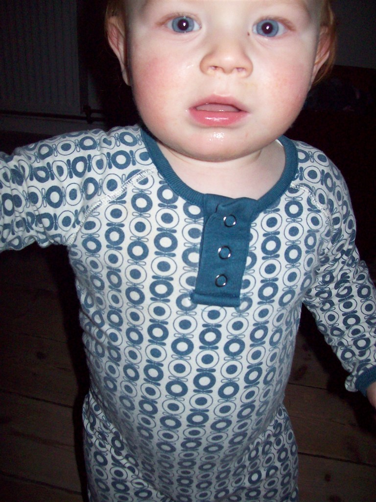 Han er glad , for det meste , har lige fået 4 tænder mere .. På en gang .,, Det tog lidt hårdt på os alle ..