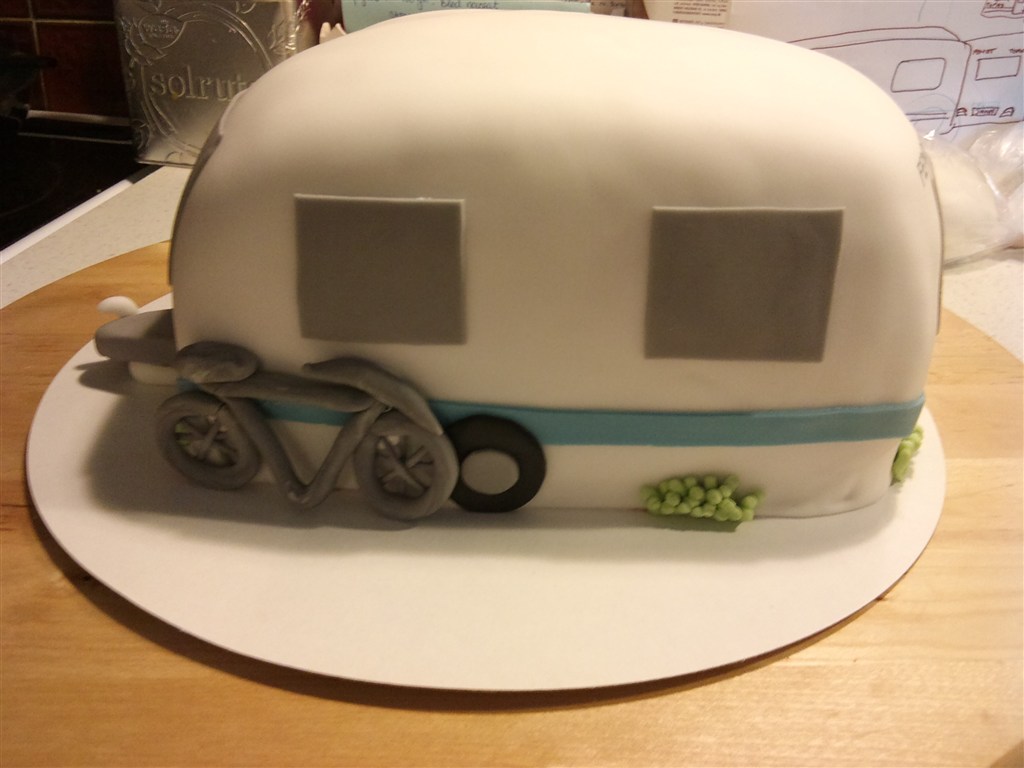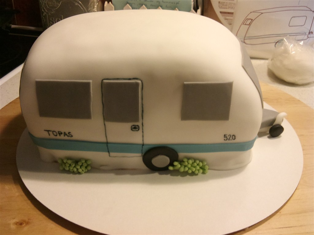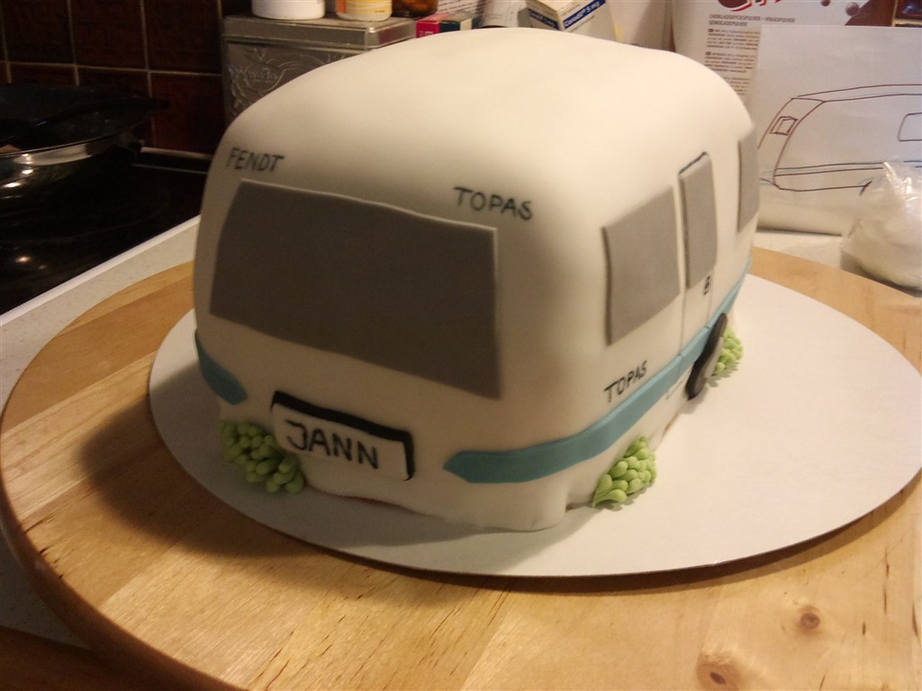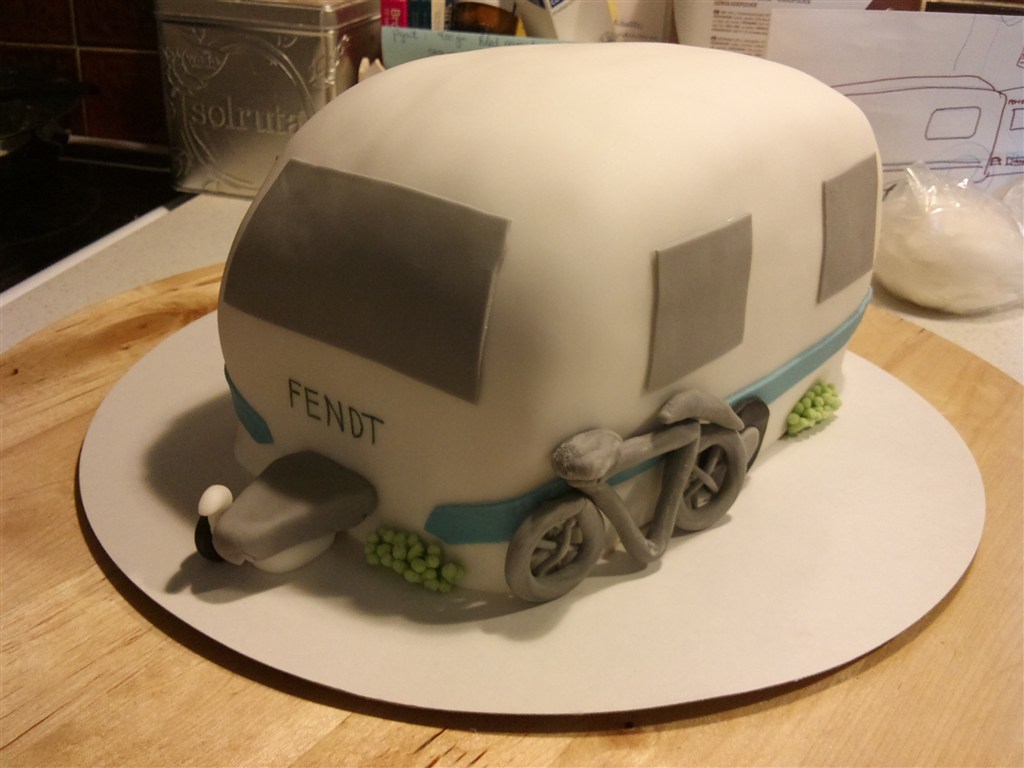 Og så en mindre campingvogn på toppen som jeg selv har kreeret på en eller anden måde. Den øverste kage ville jeg lave med grøn fondant for at symbolisere græsplænen. Har du nogle ideer eller råd du tænker jeg kan drage nytte af? Eller vil du mene jeg skal forsøge mig med en stor kage i et lag og så en campingvogn som din ovenpå? (Selvom jeg jo ikke kan komme i nærheden af dit mesterværk