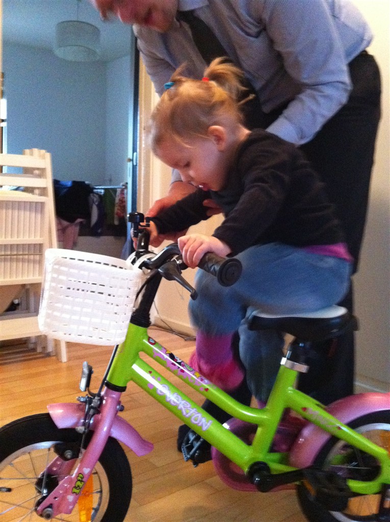 Sofie insisterede på, at der skulle støttefod på cyklen, så farmand købte en fod, og måtte derefter skære godt 10 cm af, for at den passede på den lille cykel..