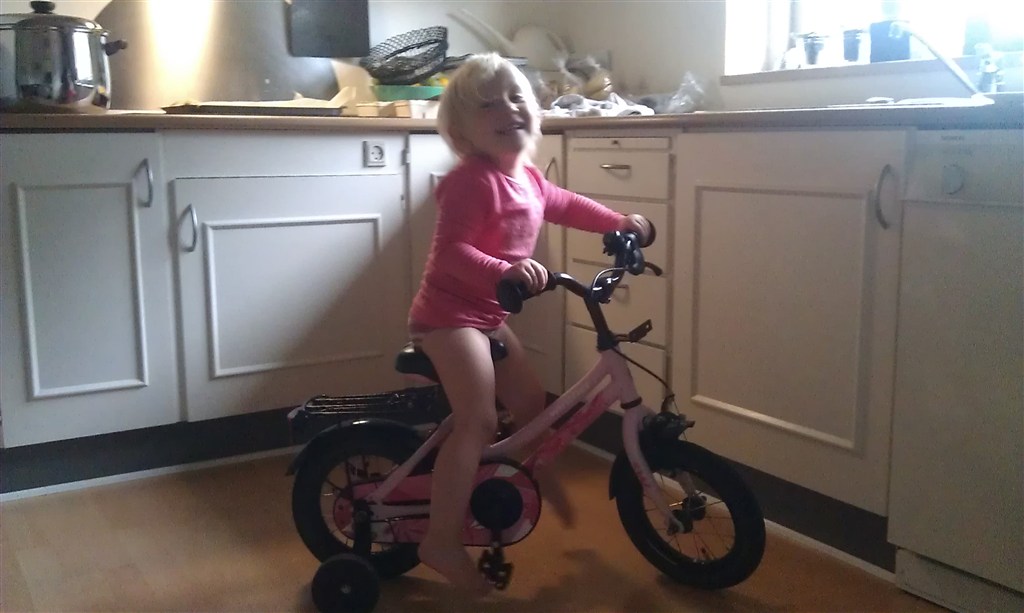 Sofie fik en lille, brugt 10" cykel med støttehjul på, da hun lige var fyldt to.. det tog ikke mange dage for hende, at lære, at cykle på den.