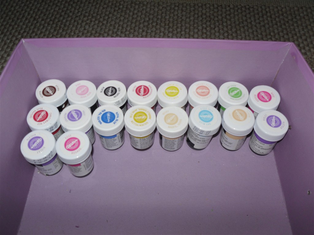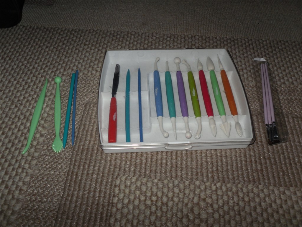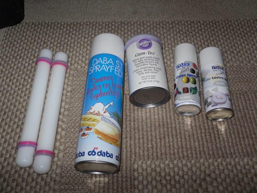 Billede 11: 2 rullepenne til og rulle fondanten ud med (Har en meget større også) "fedtstof" på dåse (til og smøre forme osv. med) Gumtex (Til og gøre fondaten mere smidig med + at lime med) 2 spray (En perlemor glans og en gennemsigtig)