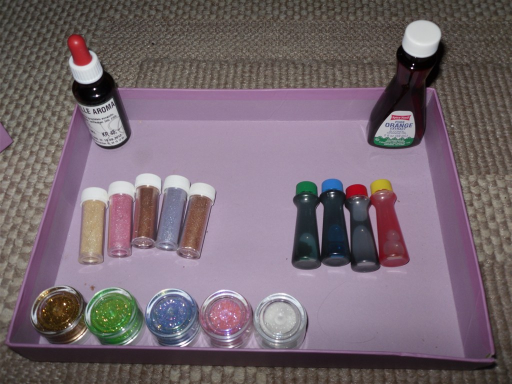 Biilede 2: Øverst til højre: Vanille essens - Øverst til venstre: Ren appelsin ekstrakt - I midten til venstre: Pearl dust pulver - Midten til højre: Frugtfarve - Nederst: Glimmer dust