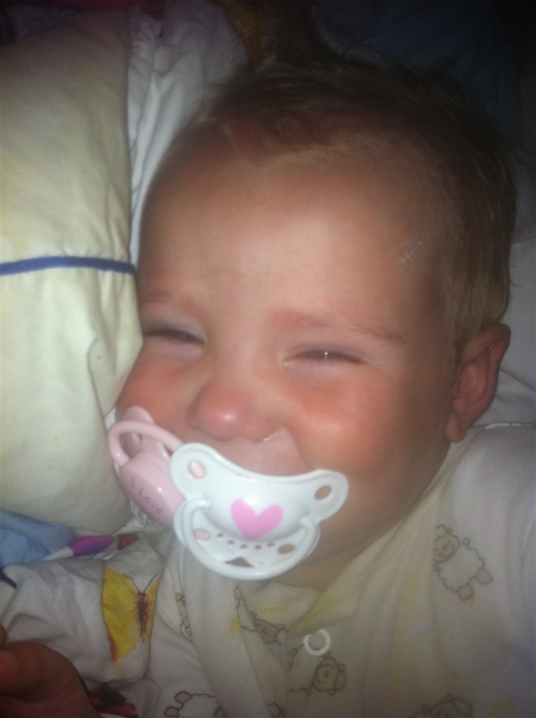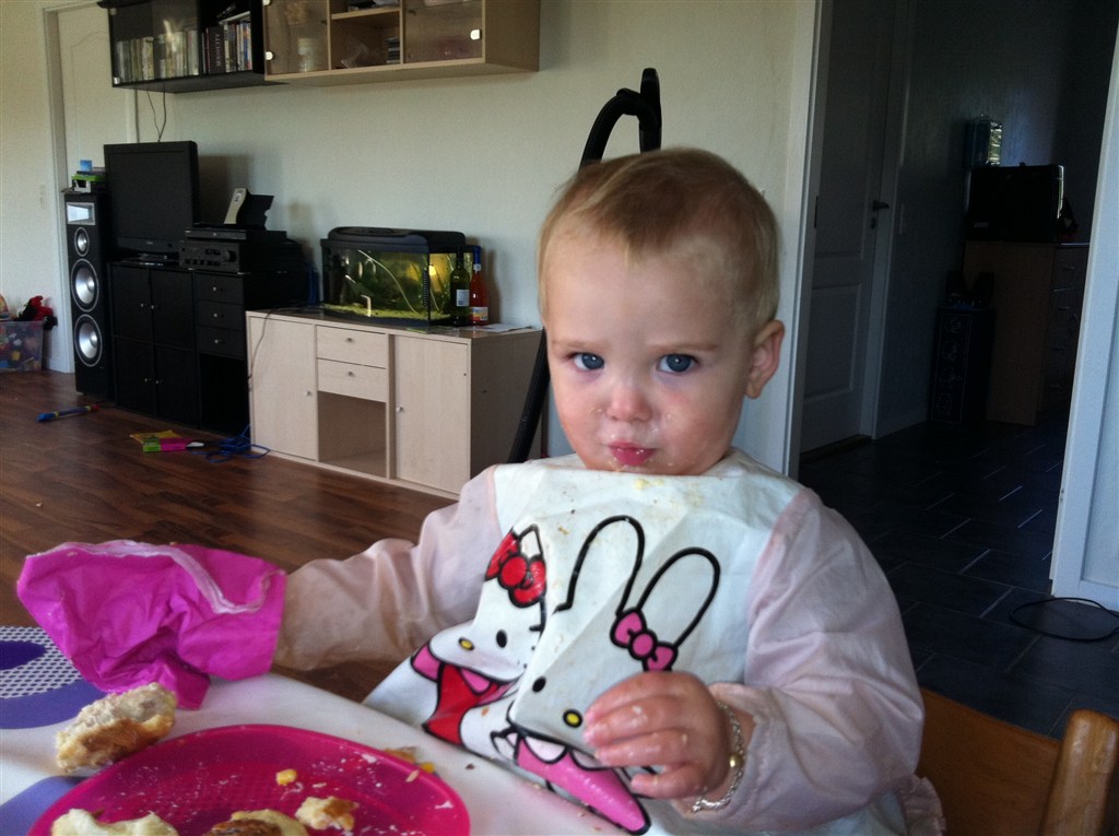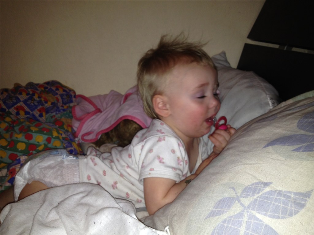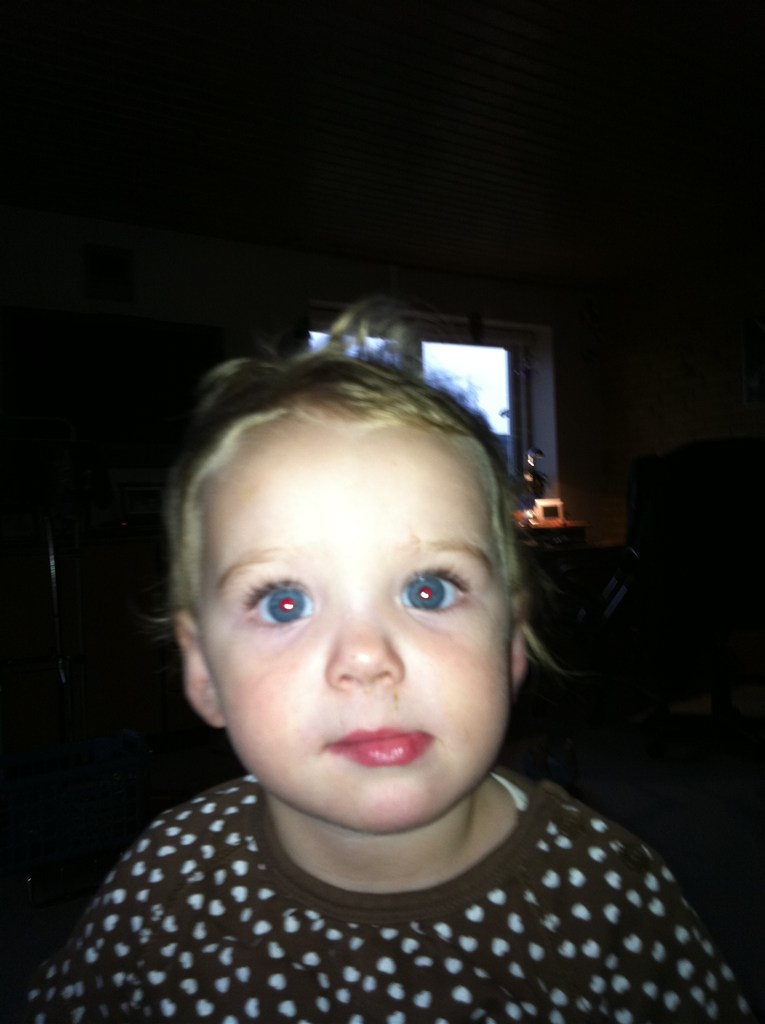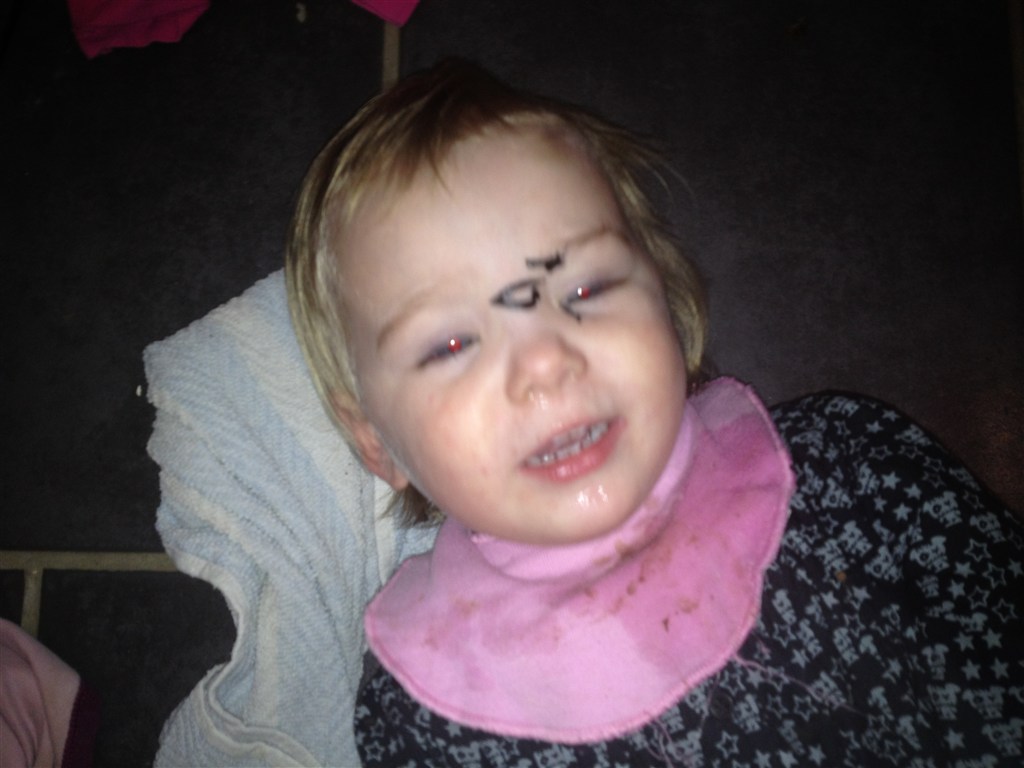 hun er blefri når vi er hjemme, har haft forbinding på armen pga både mig og hendes far var uopmærksomme i 2 sek, og hun faldt ned i mit glattejern, og fik nogle slemme brandsår, som så er ar nu