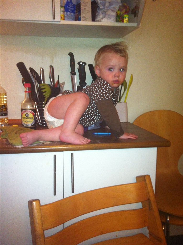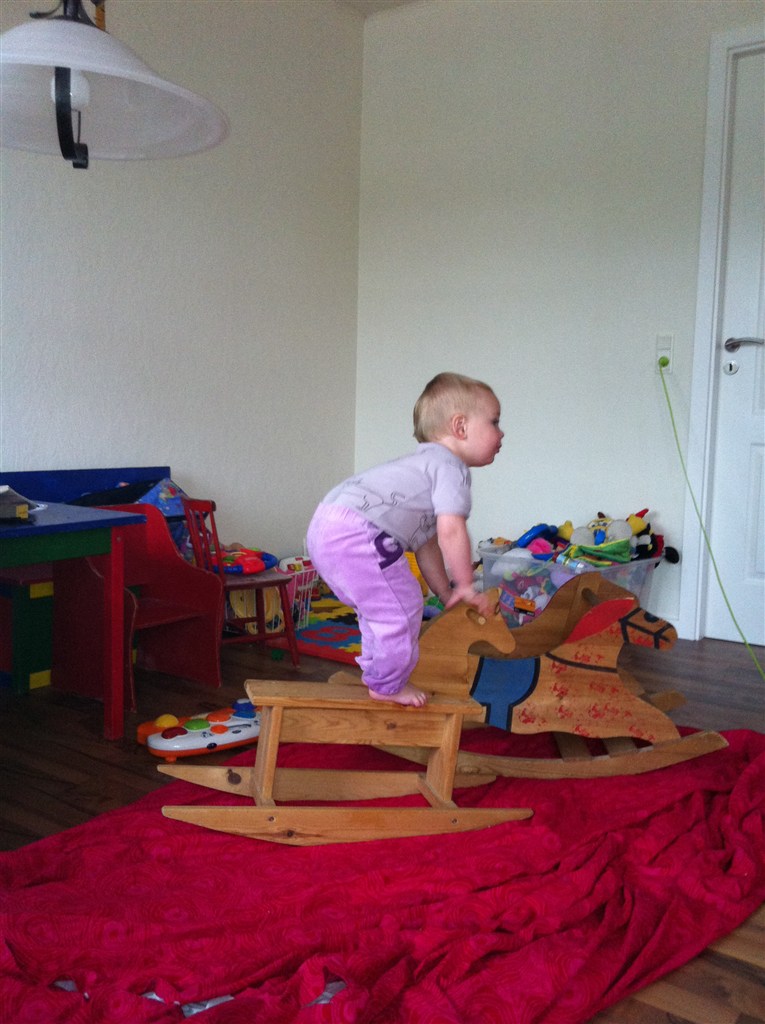 Hun er MEGET aktiv, og der skal ske noget hele tiden, om det så er hendes andet legetøj eller mine skolebøger der bliver leget med
