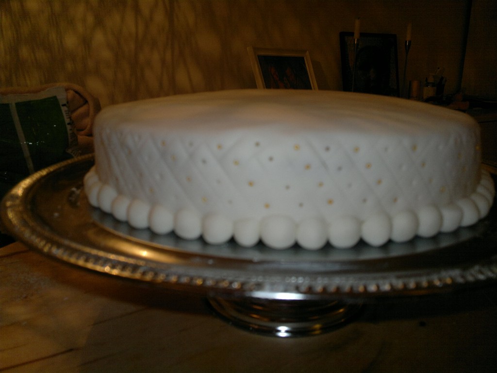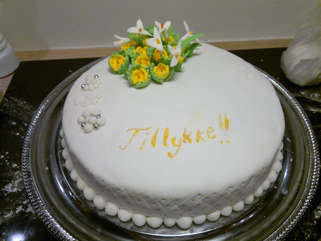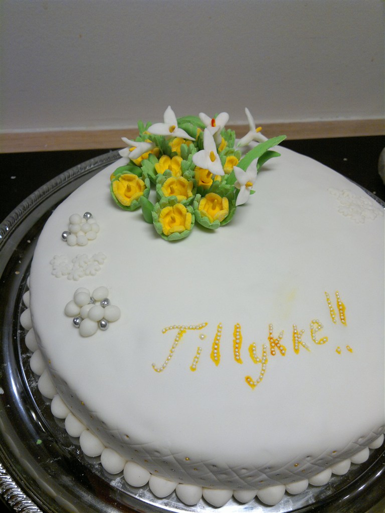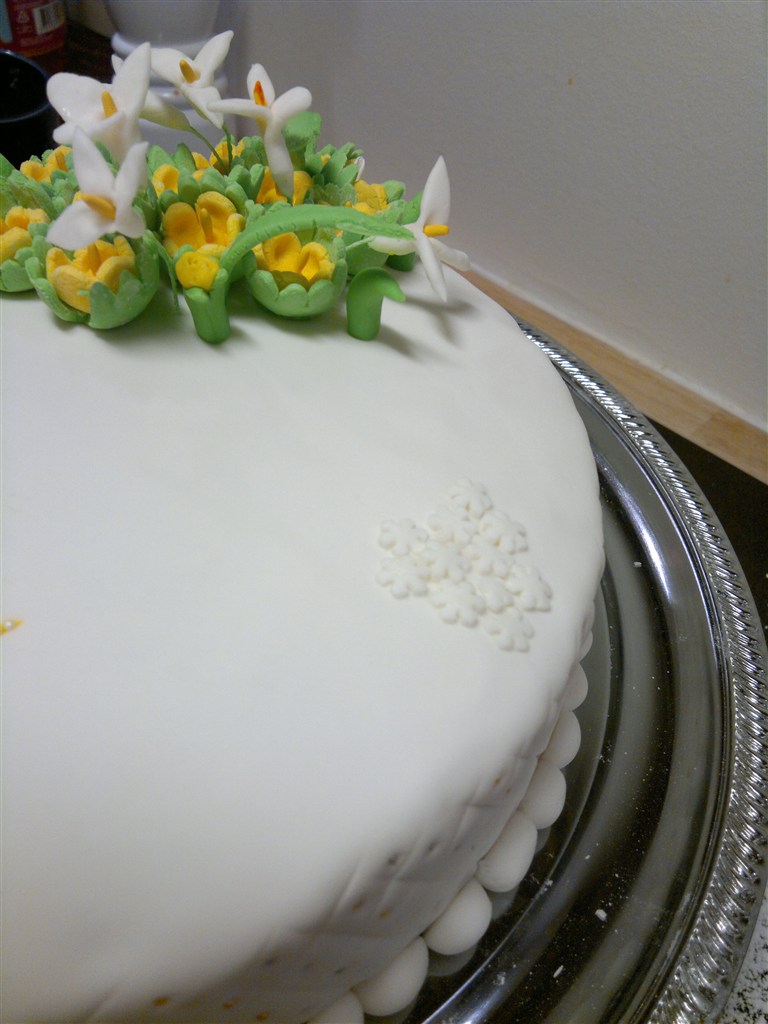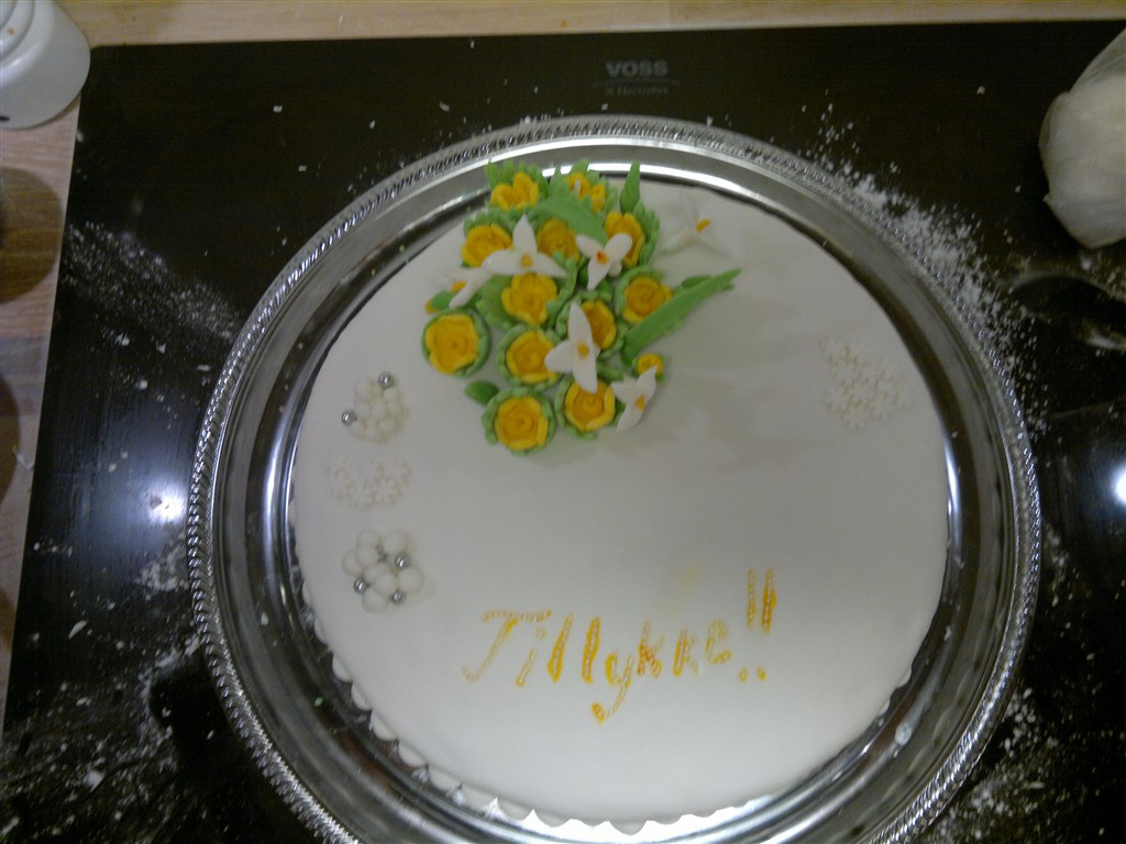 Det er en appelsinkage med en mørk chokoladecreme med kandiseret ingefær og citronskal. Smurt op med PSC og pyntet med hjemme"rørt" mmf