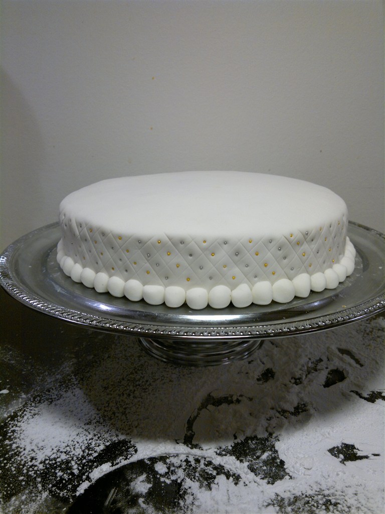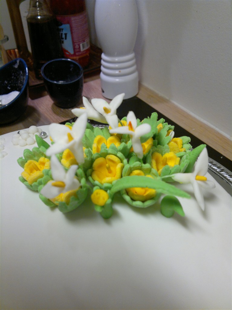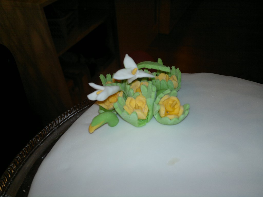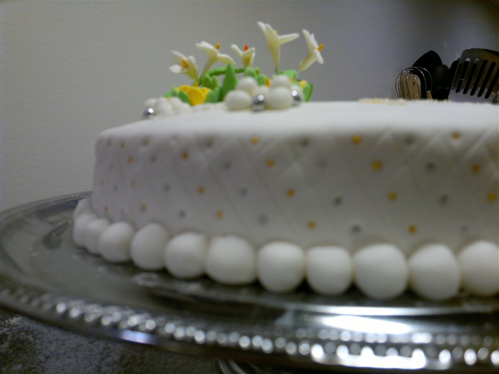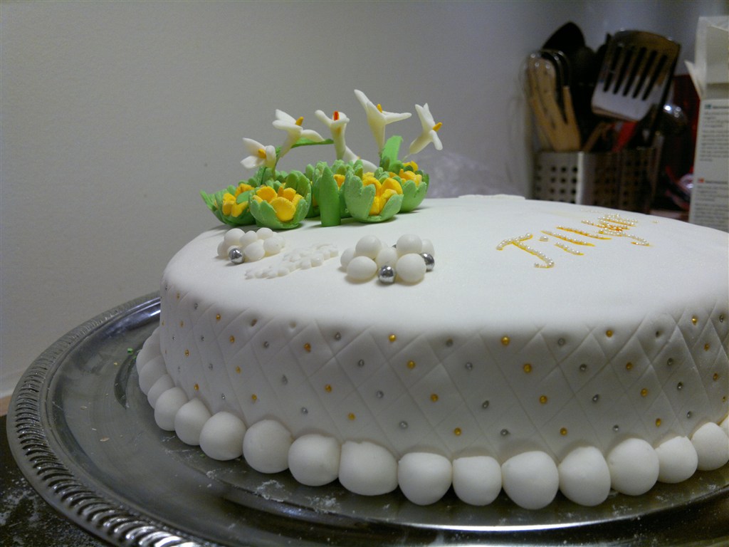 Det er en appelsinkage med en mørk chokoladecreme med kandiseret ingefær og citronskal. Smurt op med PSC og pyntet med hjemme"rørt" mmf