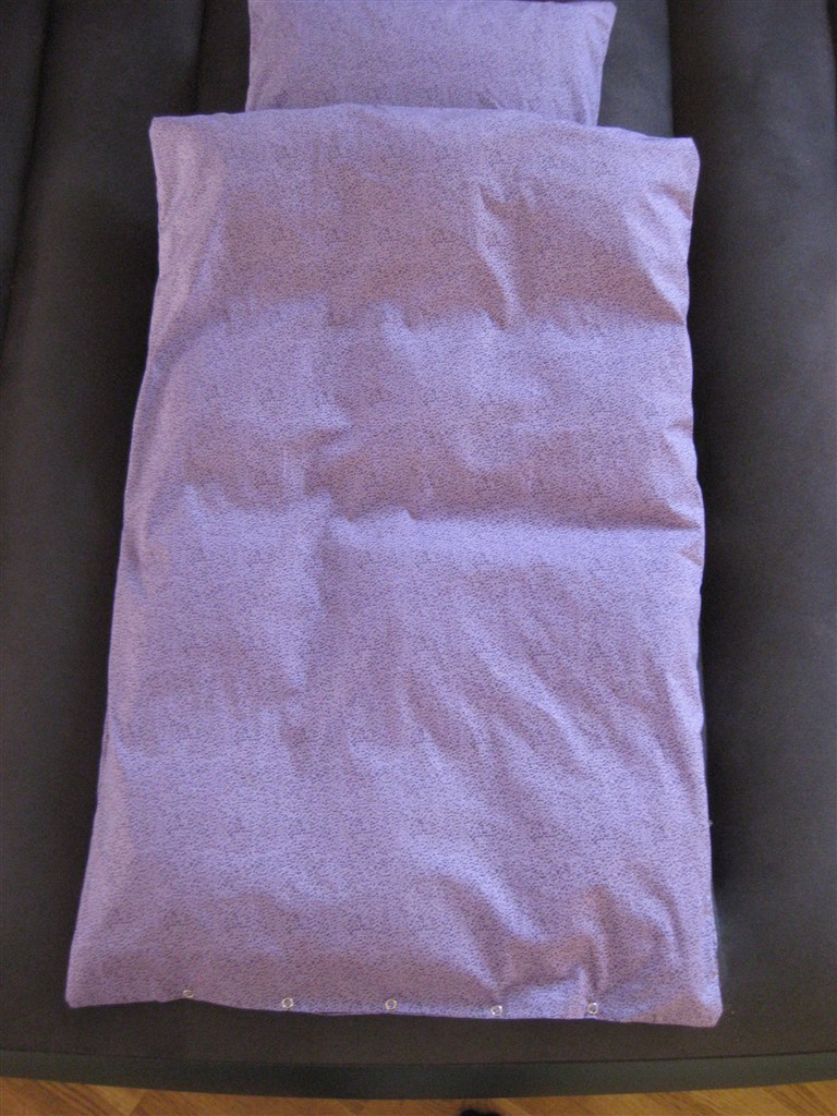 Kruse90 skriver: Hej piger.Ja må lige vise mit første projekt på symaskinen1. stk. babysengesæt.Lilla med bittesmå mørkelilla blomster.For at holde på puden har jeg syet den dersens fold (ved ikke hvad jeg ellers skulle kalde den)Dynen bliver lukket med 5 trykknapper Er super glad for resultatet.Kram Carina og lillepigen