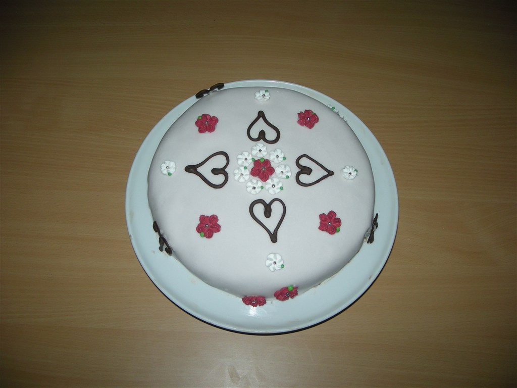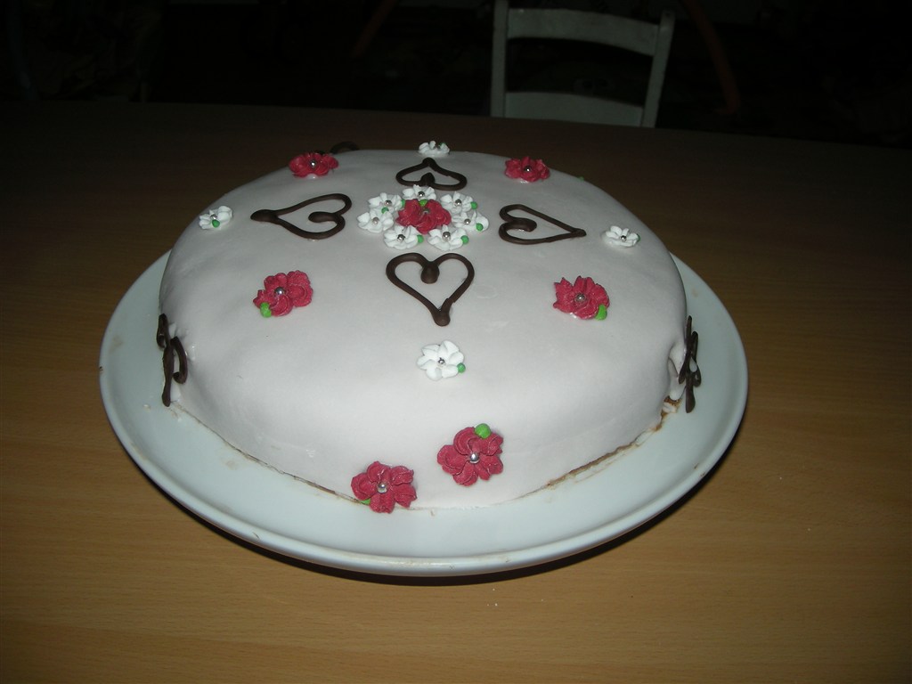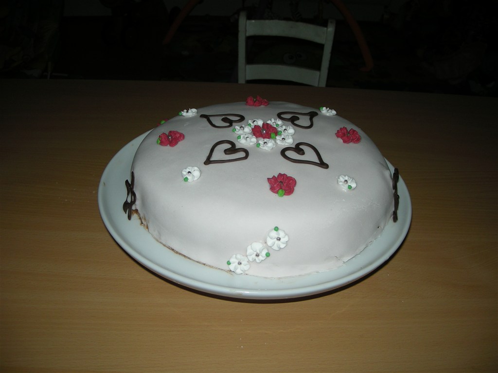 så har vi brugt en del timer, men nu er den endelig færdig, manden og jeg har sammen lavet vores aller første MMF (Marsmellows fondant) kage må simpelthen sige at den ser virkelig pæn ud, og den smager SÅ godt! dog en del eftersmag af sukker men det var sjovt at prøve og det er ABSOLUT ikke sidste gang