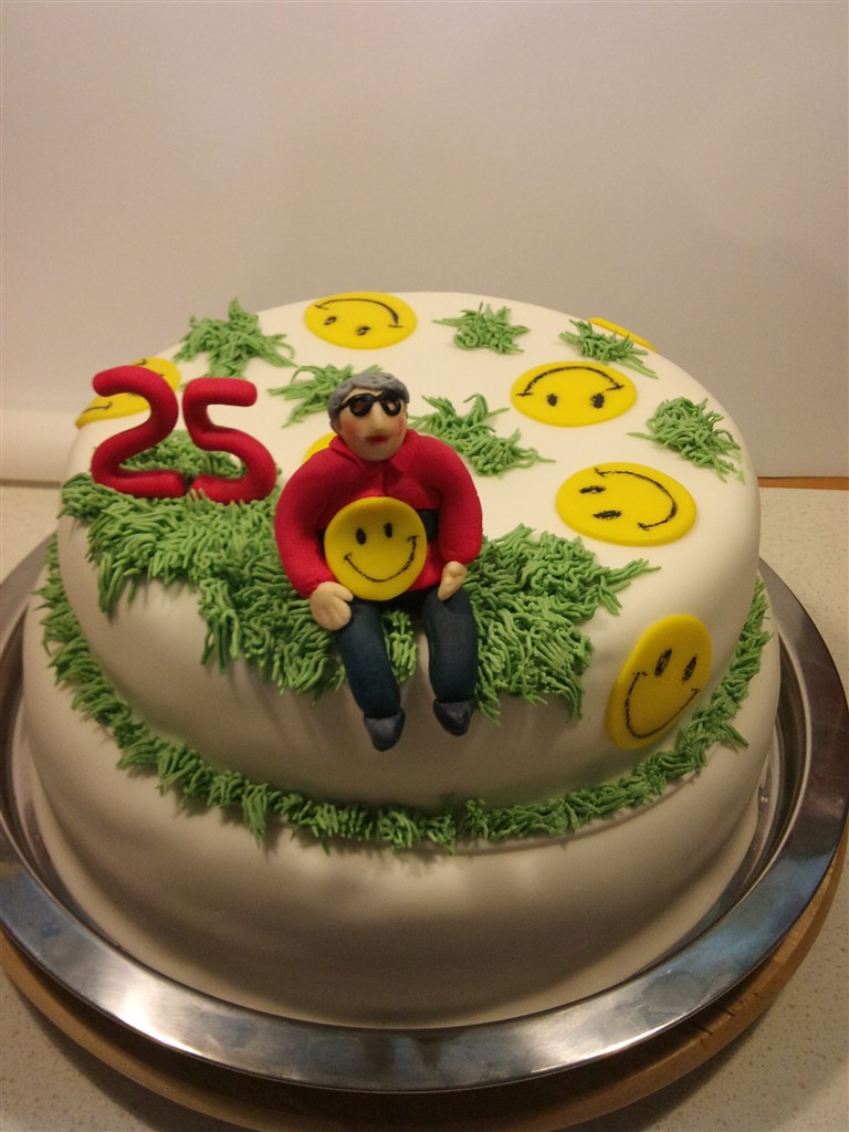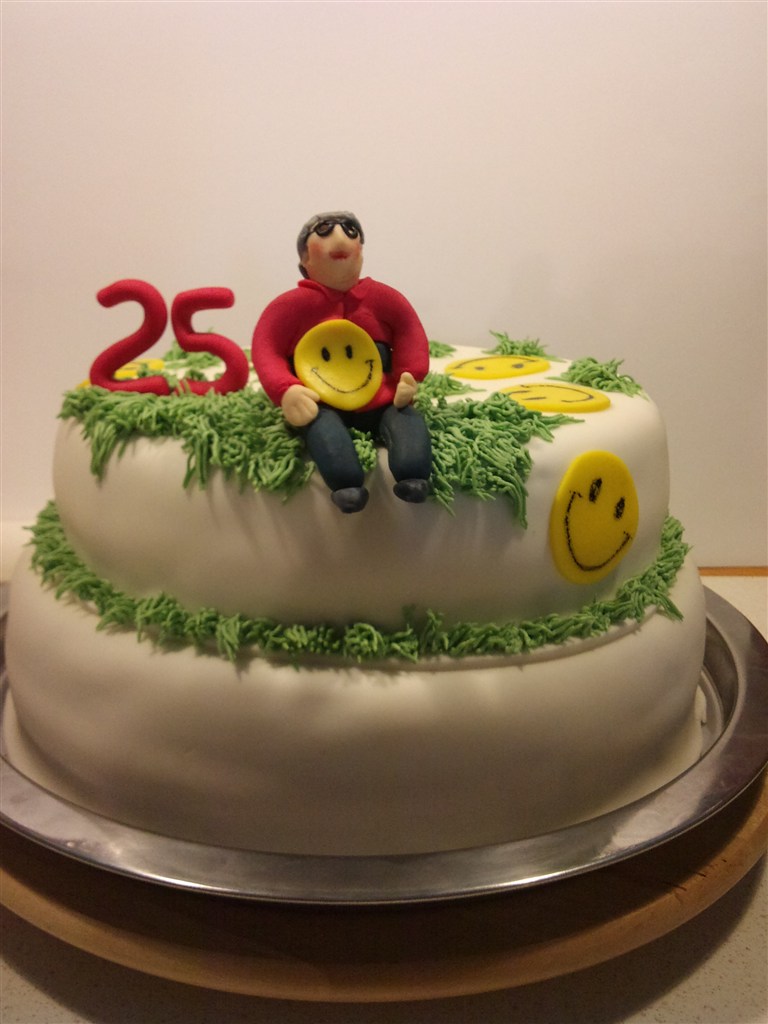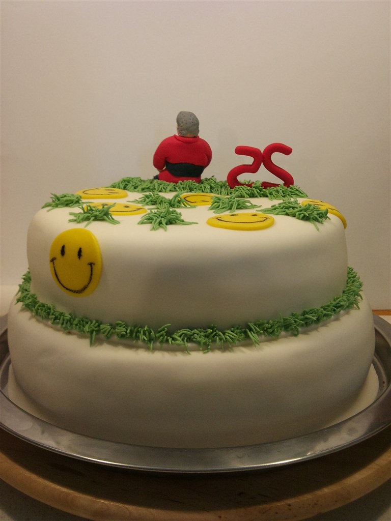 Det blev med en masse Brugsen smileys på og så en figur, der skulle ligne, men jeg må erkende, at når det skal ligne en bestemt person, så er mine evner ikke til det... Sophie sagde til mig:" mor, hvem er den mand, du sætter på kagen?" hi hi hi, ikke så heldigt