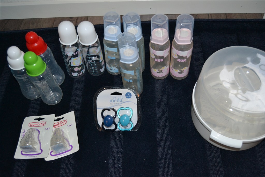 1o sutteflasker bla. 5 nuk flasker og de andre kan godt bruge nuk sutter, sælges sammen med 2 alm. sutter til 3 mdr. og en sutteflaskekoger til micro ovnen. Alt sælges samlet til 250kr.