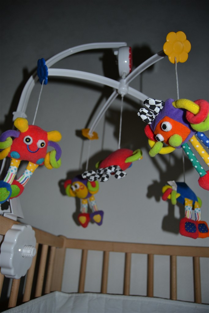 Uro til at sidde på siden af tremmeseng eller kravlegård og den kan dreje rundt. Til salg for 75kr, kender ikke ny pris.