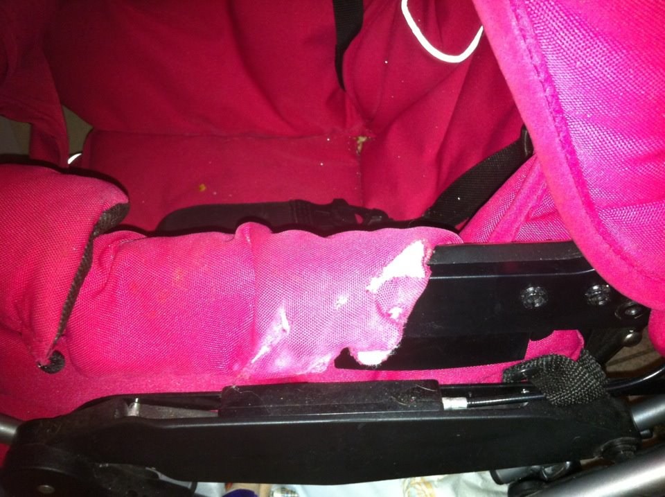 Den er 1 1/2 år gammel, og fejler intet, udover at der i den ene side i stoffet, er kommet en flænge. (billede vedhæftet). Dette dækkes dog af køreposen, og ellers kan man selv fikse det, hvis man vil.