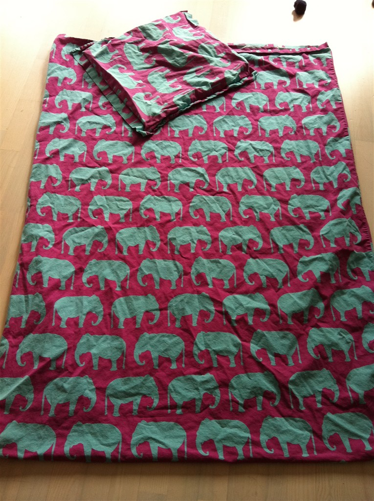 Sødt junior sengetøj i pink med turkise elefanter. Sengetøjet er med knaplukning i både dyne og pudebetræk.