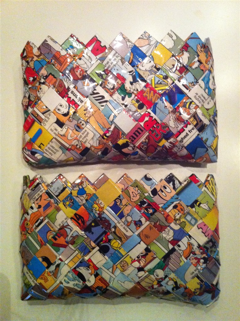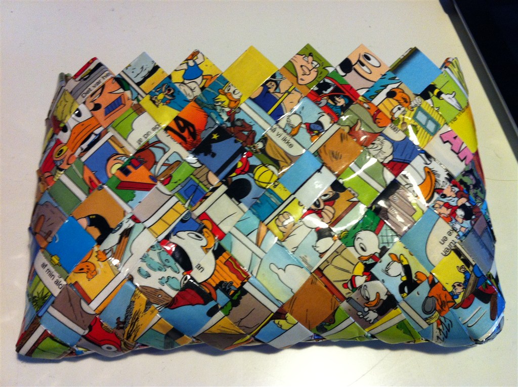 Så fletter jeg tasker, i alt mulig materiale.. Er lige gået i gang med projekt Anders And tasker, har fået flettet 3 indtil videre..