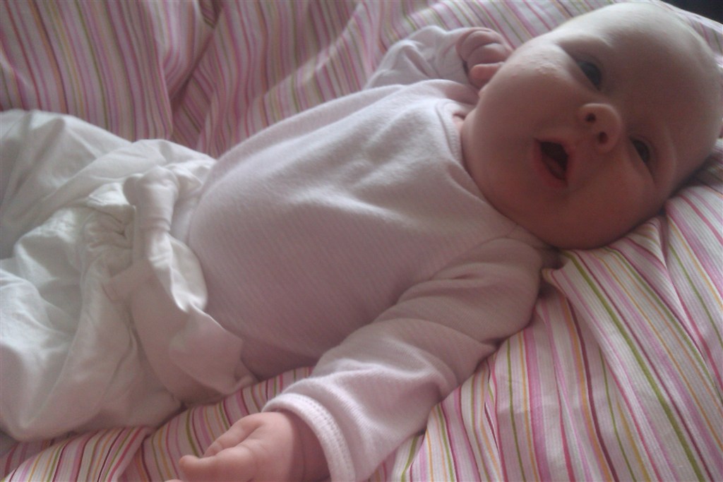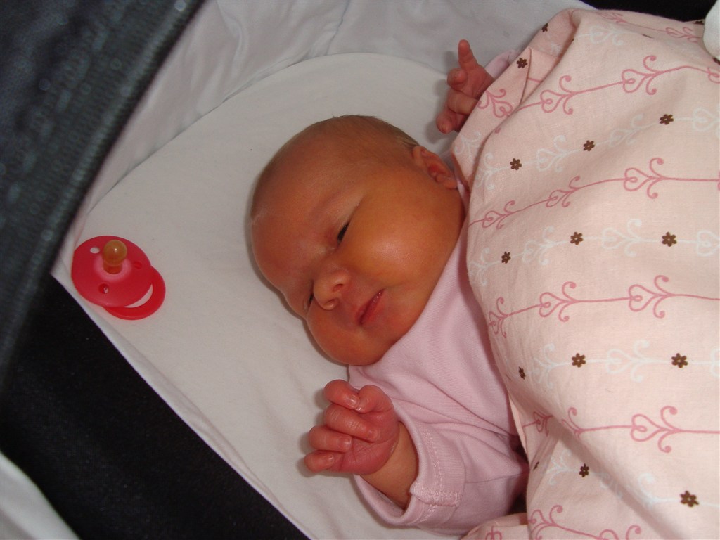 Et billede fra da hun er et par dage gammel, og et billede fra hun er næsten 7 uger gammel.