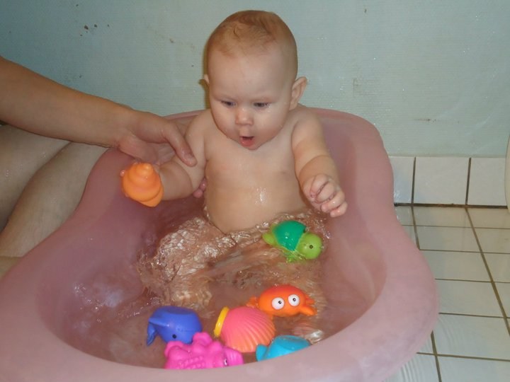 Johanna elsker også at bade, men det er lidt forskelligt hvor tit det bliver. Der kan godt gå en uge eller mere imellem at hun er rigtigt i karbad. Som regel er hun med enten mig eller sin far i brusebad et par gange derimellem.