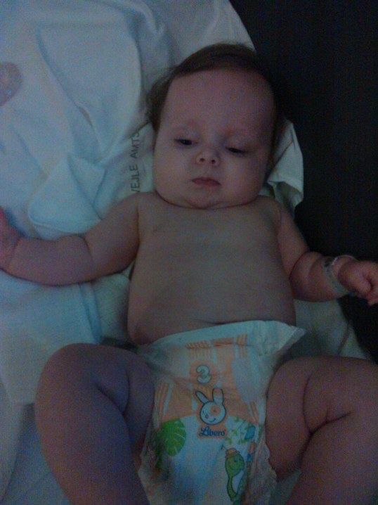 åååh gud, tænkte jeg. og fik tåre i øjnene. Det hele virkede så voldsomt, og sophia var dybt ulykkelig. Vi ankommer på børneafdelingen, og de undersøger sophia, og hun får en pulsmåler på, som viste at hendes puls næsten lå helt oppe på 200, og når hun blev sur røg den over. Og så bliver man jo endnu mere bekymret. Hun fik taget blodprøver, hvilket heller ikke var sjovt. Bagefter blev vi vidst ned på en stue. 1 time efter fik vi svar på prøverne, - ingen infektion. "DEJLIGT!", så de mente det var en virus. Vi blev der resten af natten. Om morgenen havde hun en temperatur på 37,9, så meget bedre. Ved middagstid kom der en børnelæge ind og kiggede på hende. Det første han siger er at hun er tyk. HEY!