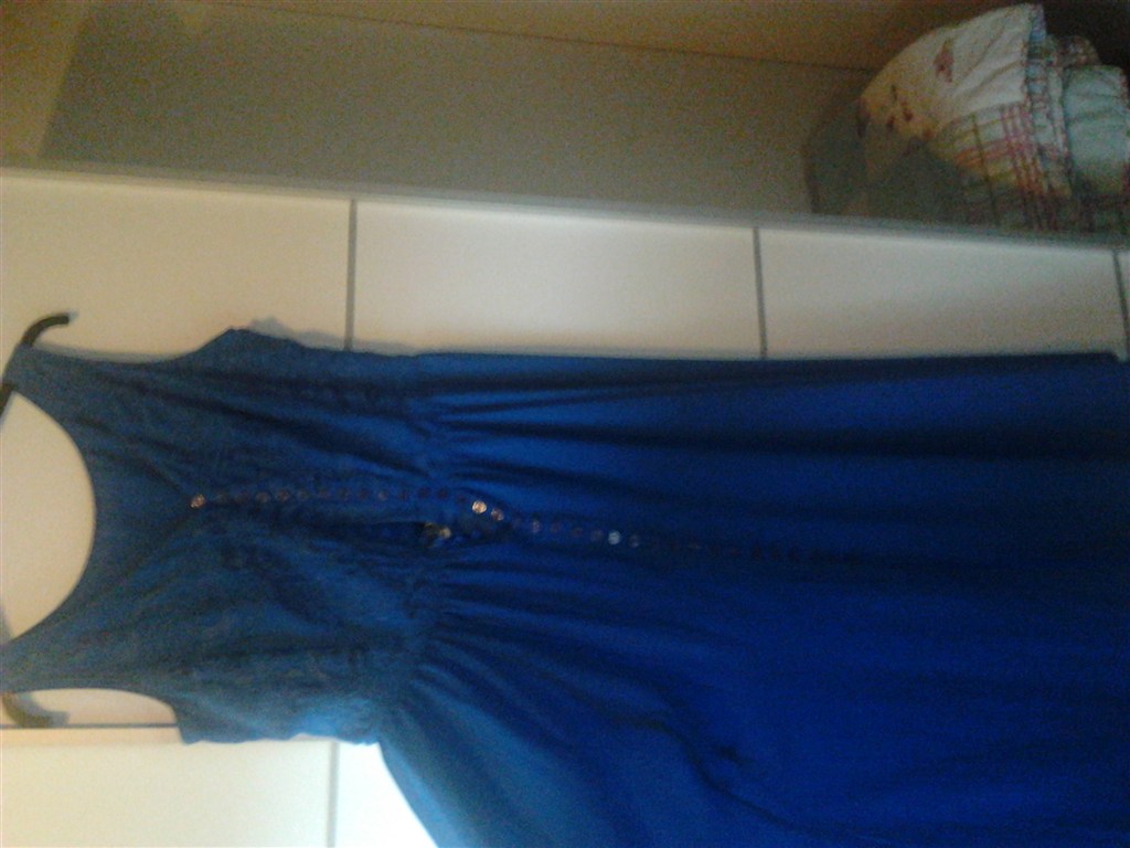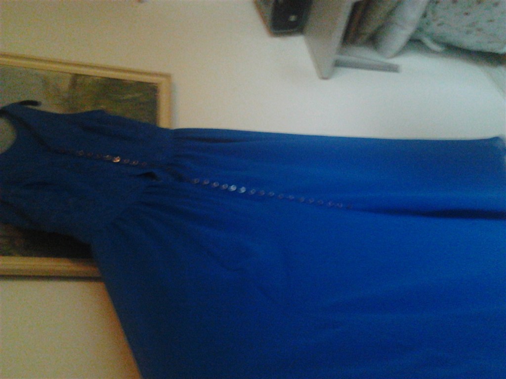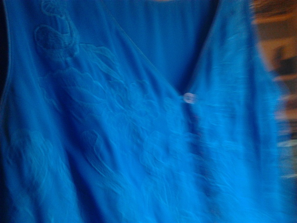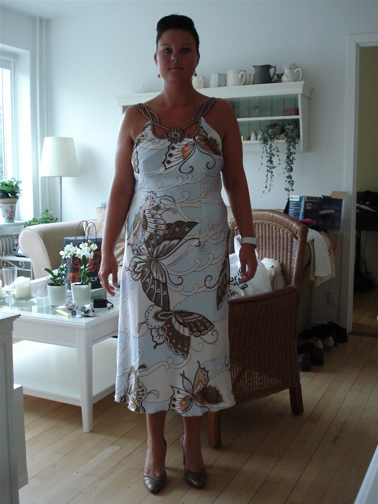 jeg har da i hvert fald en, - den er lys koboltblå nærmest, og i sådan noget tyndt let gennemsigtigt i flere lag oven på hinanden i skørtet, og med silkebroderi i blomster på overdelen. Små knapper hele vejen ned foran.
