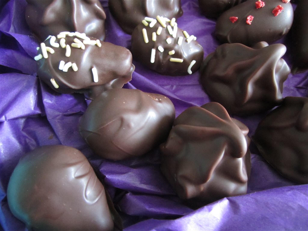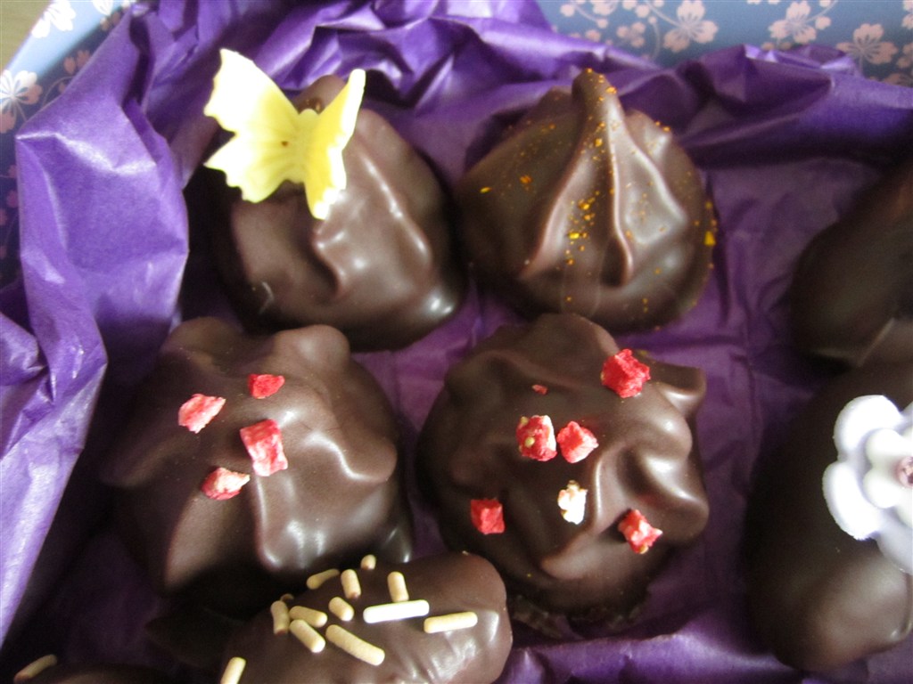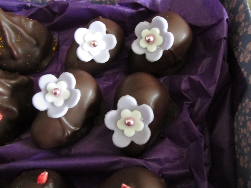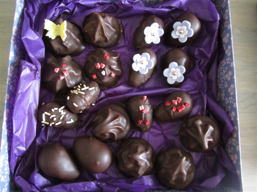 Æggene er med nougat , kaffe , jordbær og ren marcipan .. Og nogle af flødebollerne er med jordbærskum (: De er GODE !