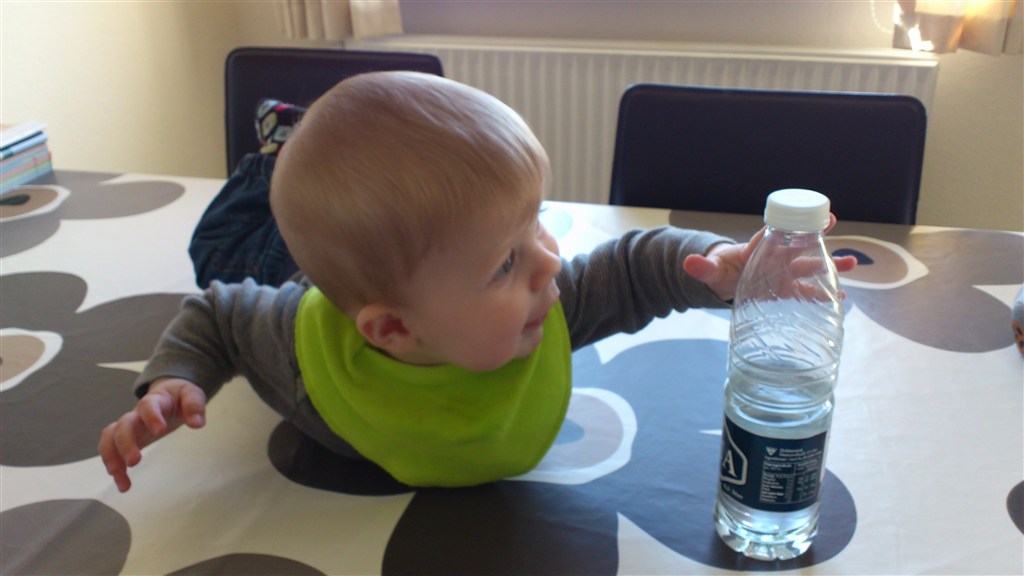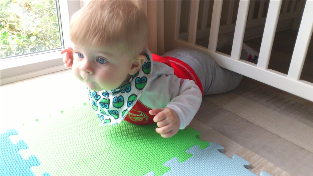 Han triller fra ryg til mave (ligger aldrig på ryggen mere)! Han skubber arme op, lægger dem ned og derefter benene.. hehe!