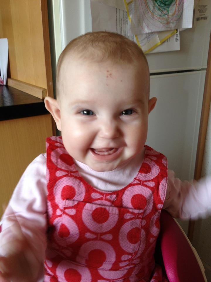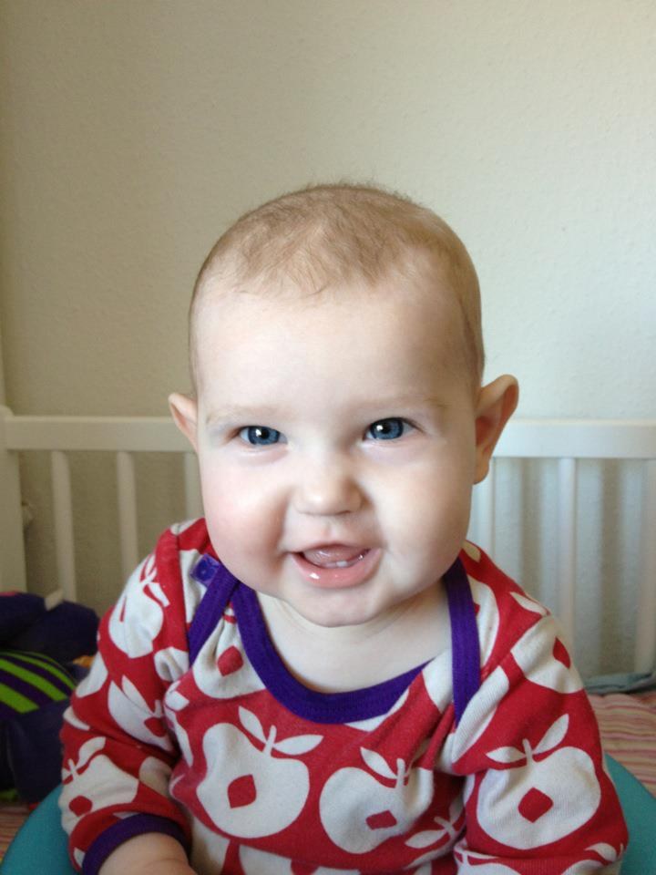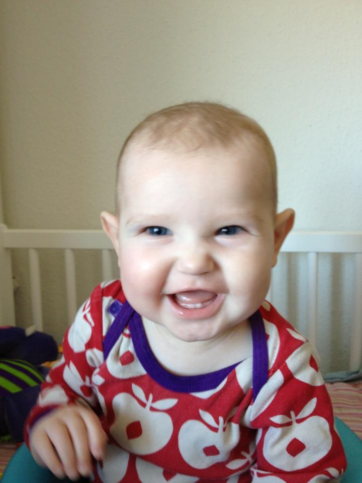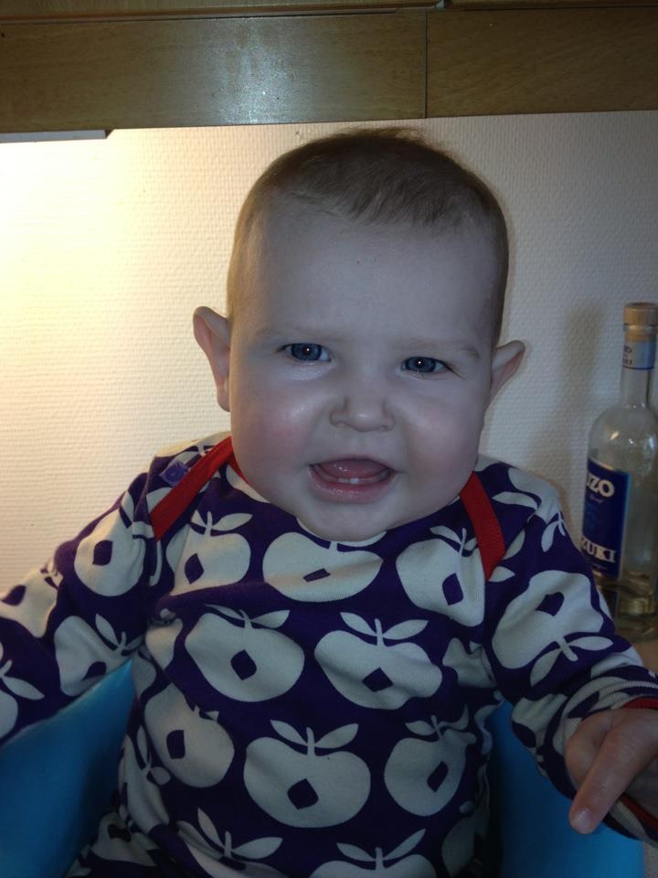 Hun er næsten altid glad og spiser godt. Hun pludre meget, råber, klapper kage og triller fra ryg til mave men ikke tilbage