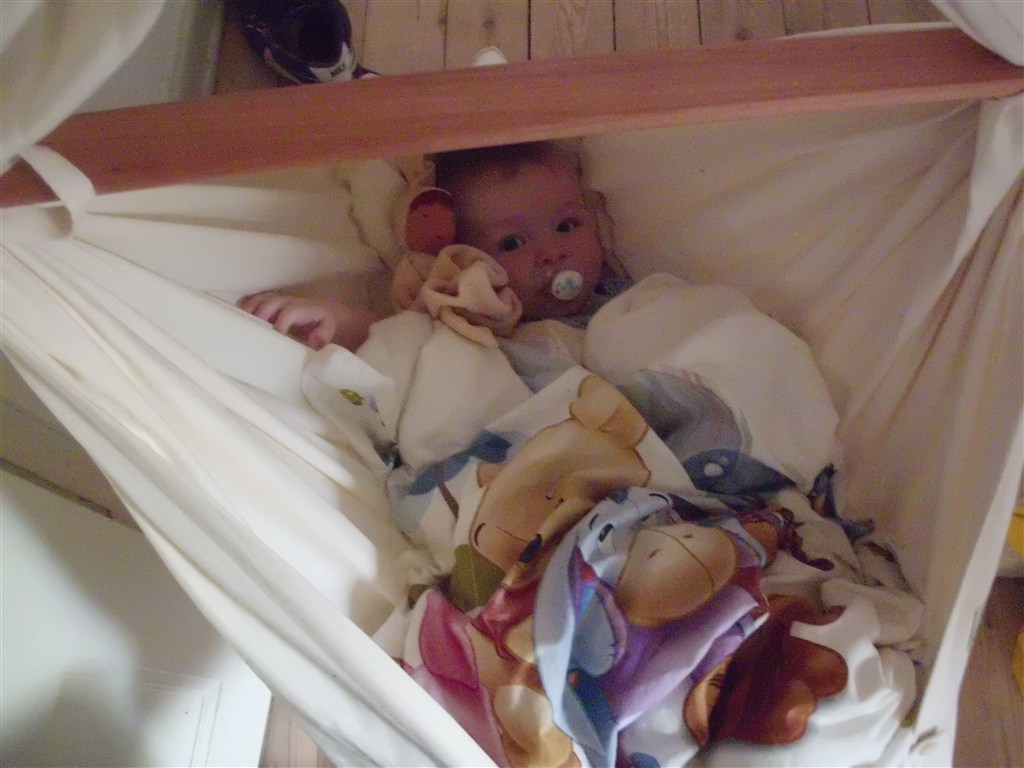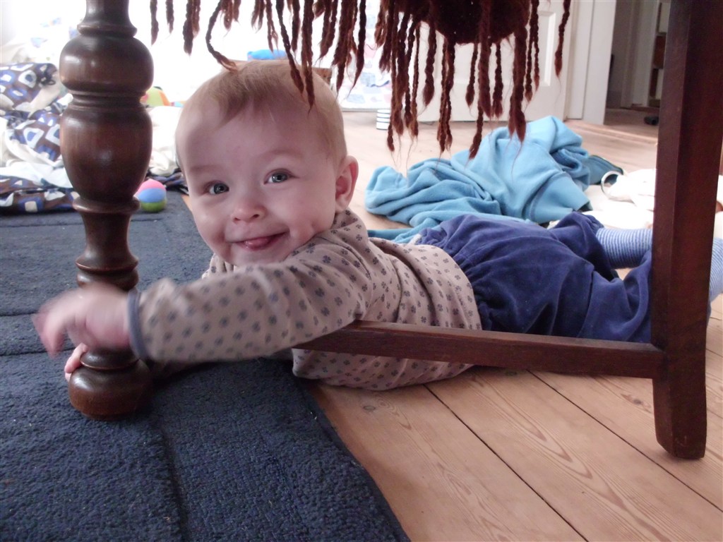 Han er 6 en halv måned gammel og er ved at øve sig i at kravle. Han har lige fået en slynge vugge, som han virkelig nyder at slappe af i
